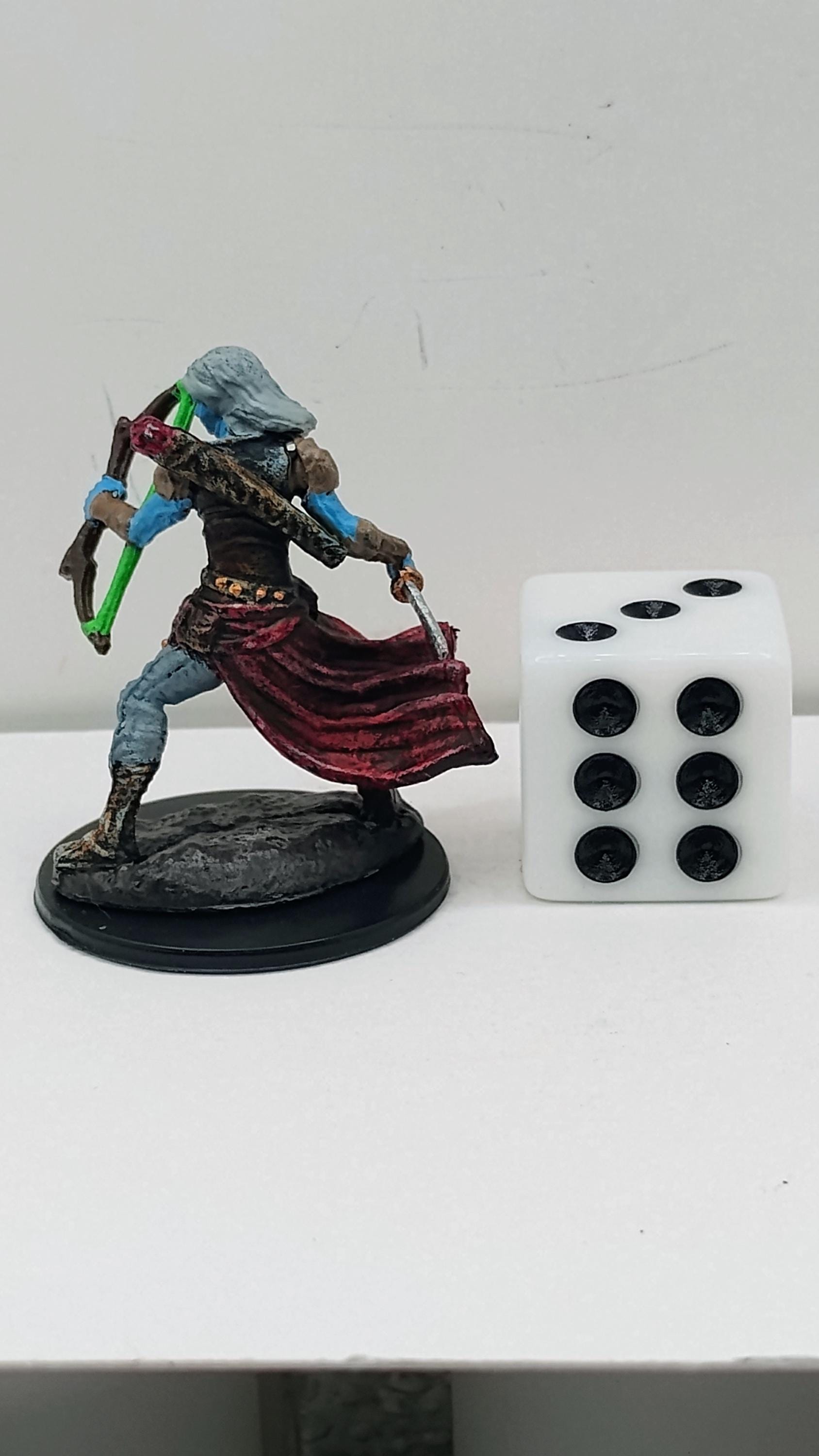 This Air Genasi Rogue miniature strikes with wind-kissed grace, drawing a vibrant green bow with the agility of a storm-born hunter. Cloaked in swirling fabrics and a crimson sash, he's perfect for stealthy scouts, aerial assassins, or elemental infiltrators in any high-fantasy campaign.
