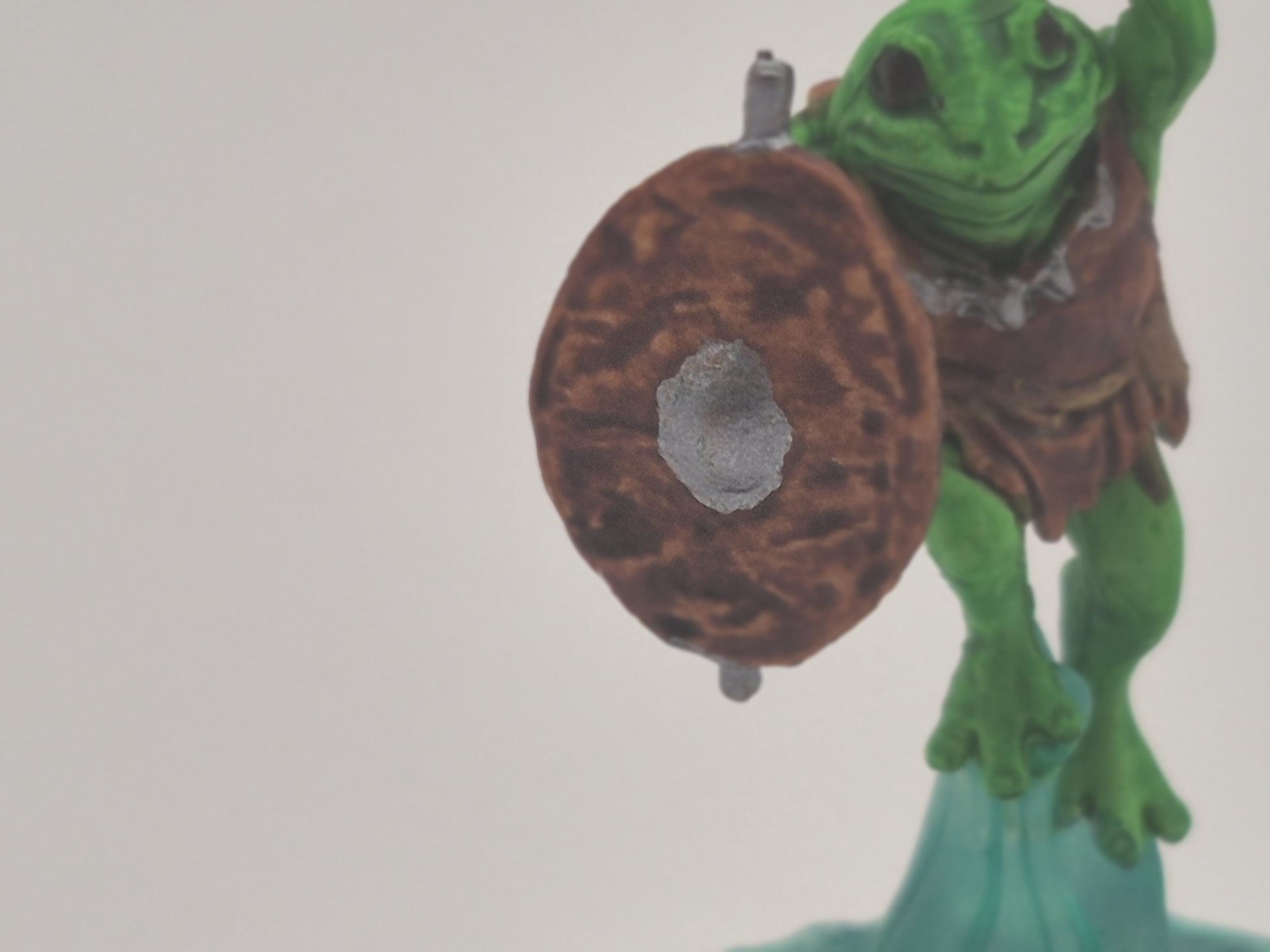 This dynamic bullywug miniature is captured mid-leap, bursting from water with sword raised and shield at the ready. Ideal for ambushes or surprise attacks, it embodies the agility and ferocity of swamp-dwelling frogfolk warriors.