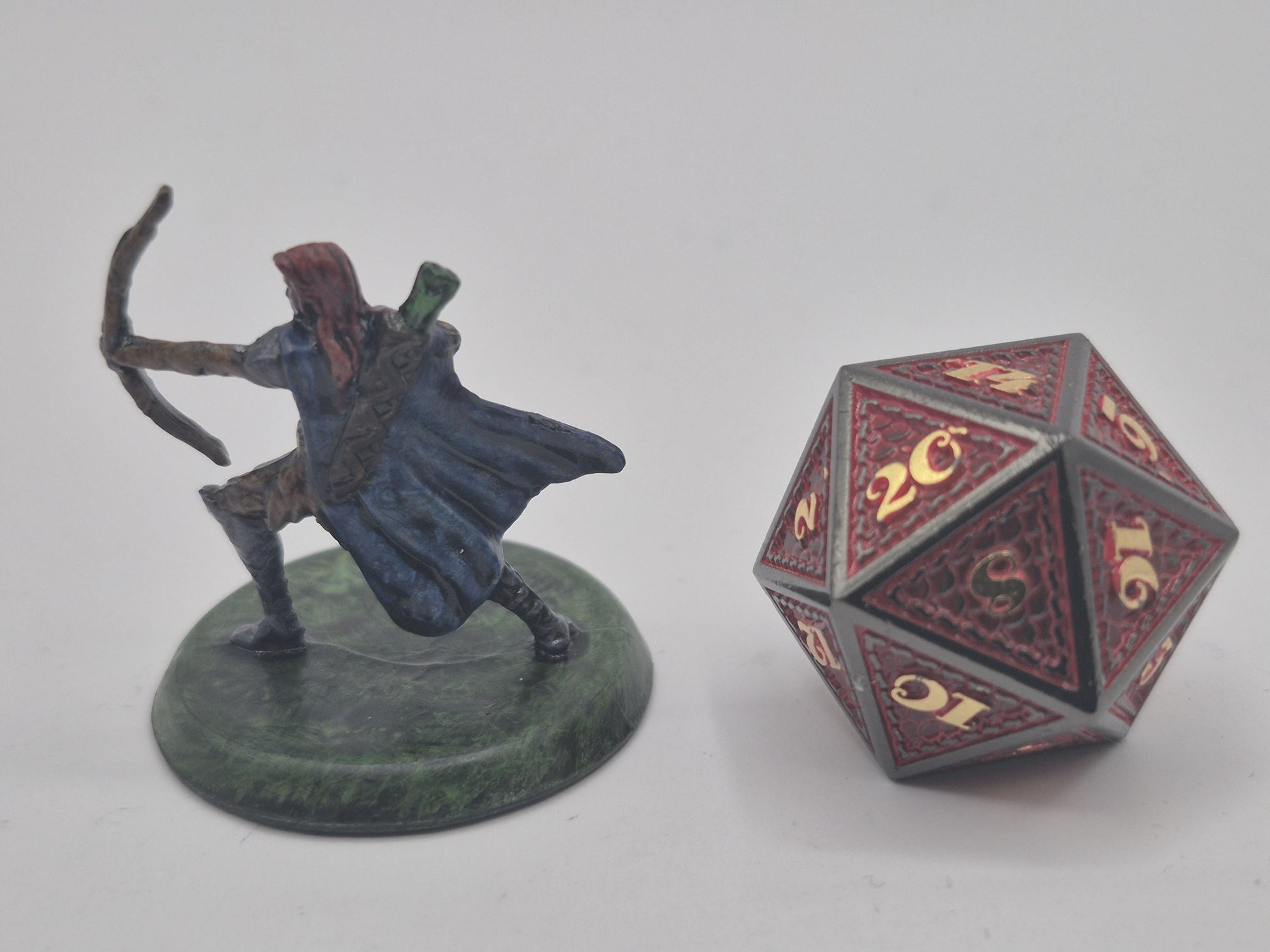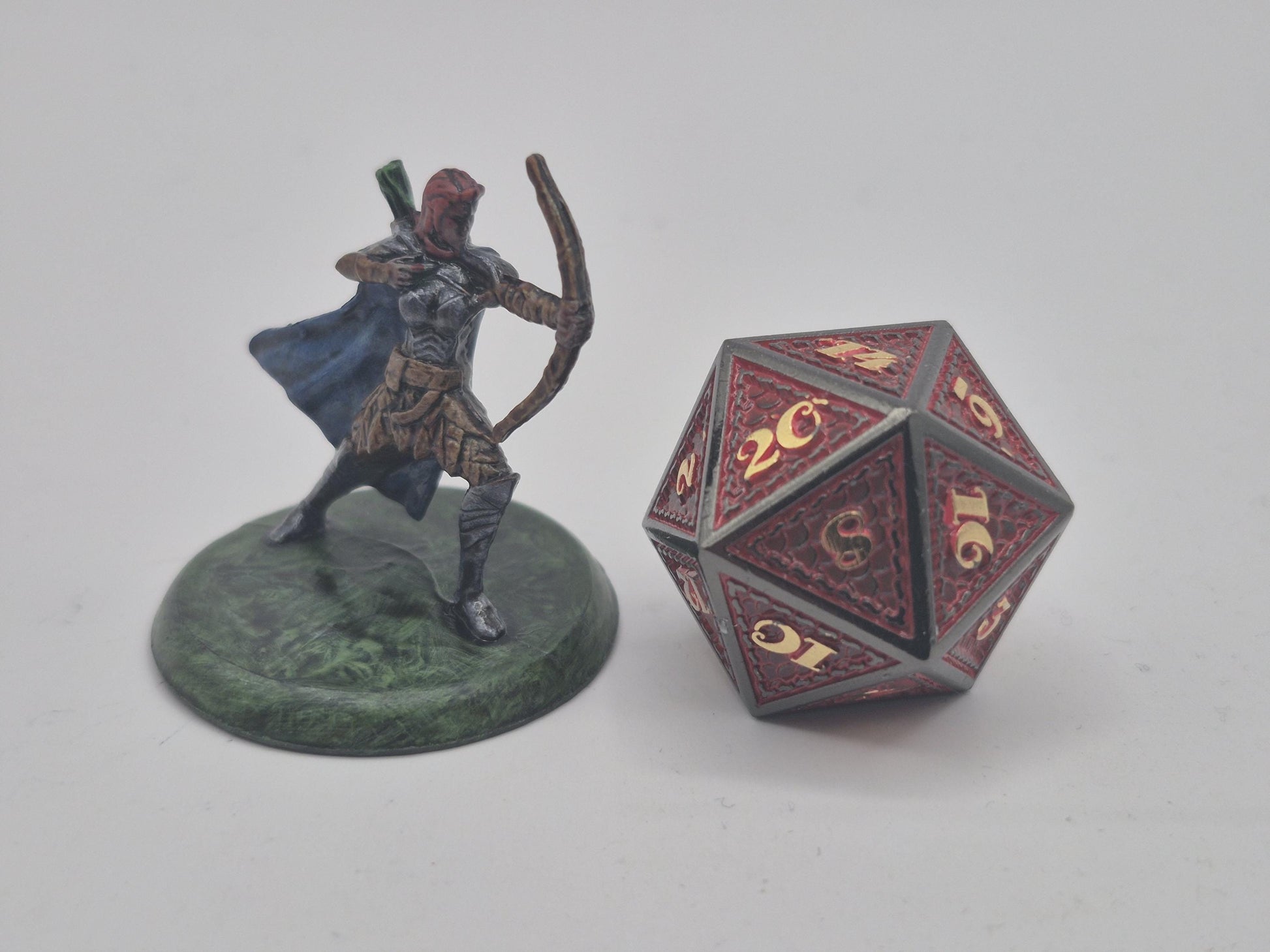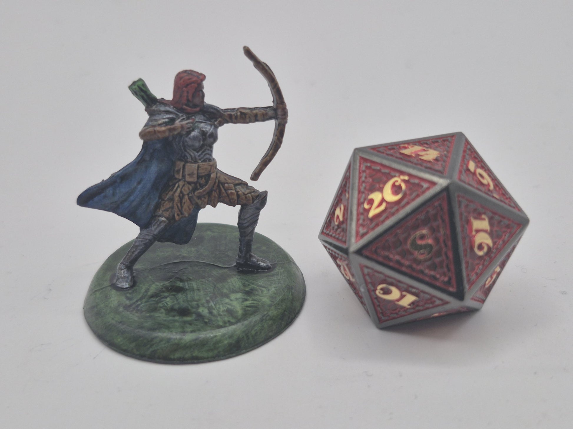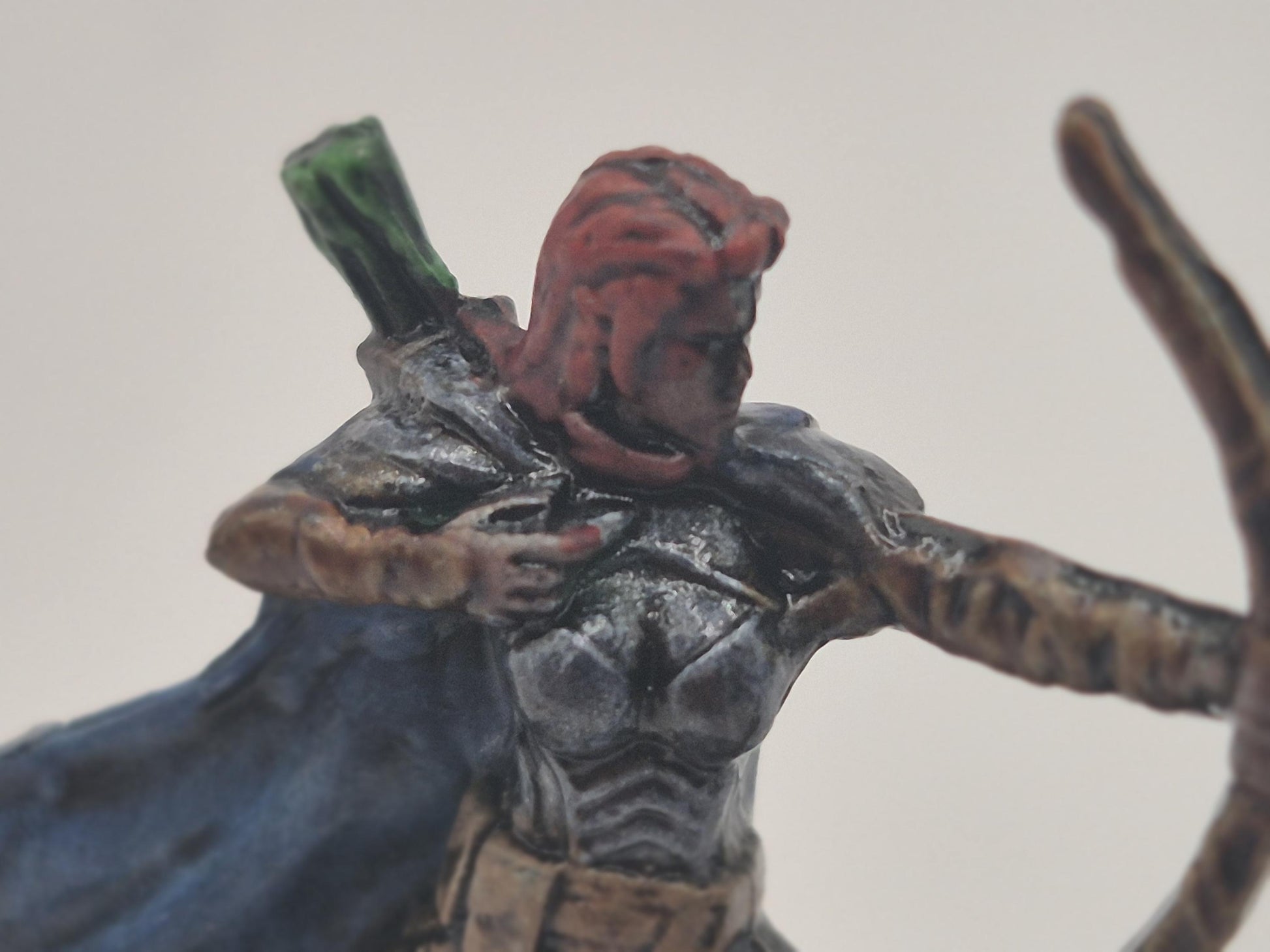 With piercing focus and a crimson mane, this human archer unleashes her bow beneath a sweeping blue cloak. Her armor is scarred but sturdy, and her green-fletched arrows fly with the vengeance of the wild.