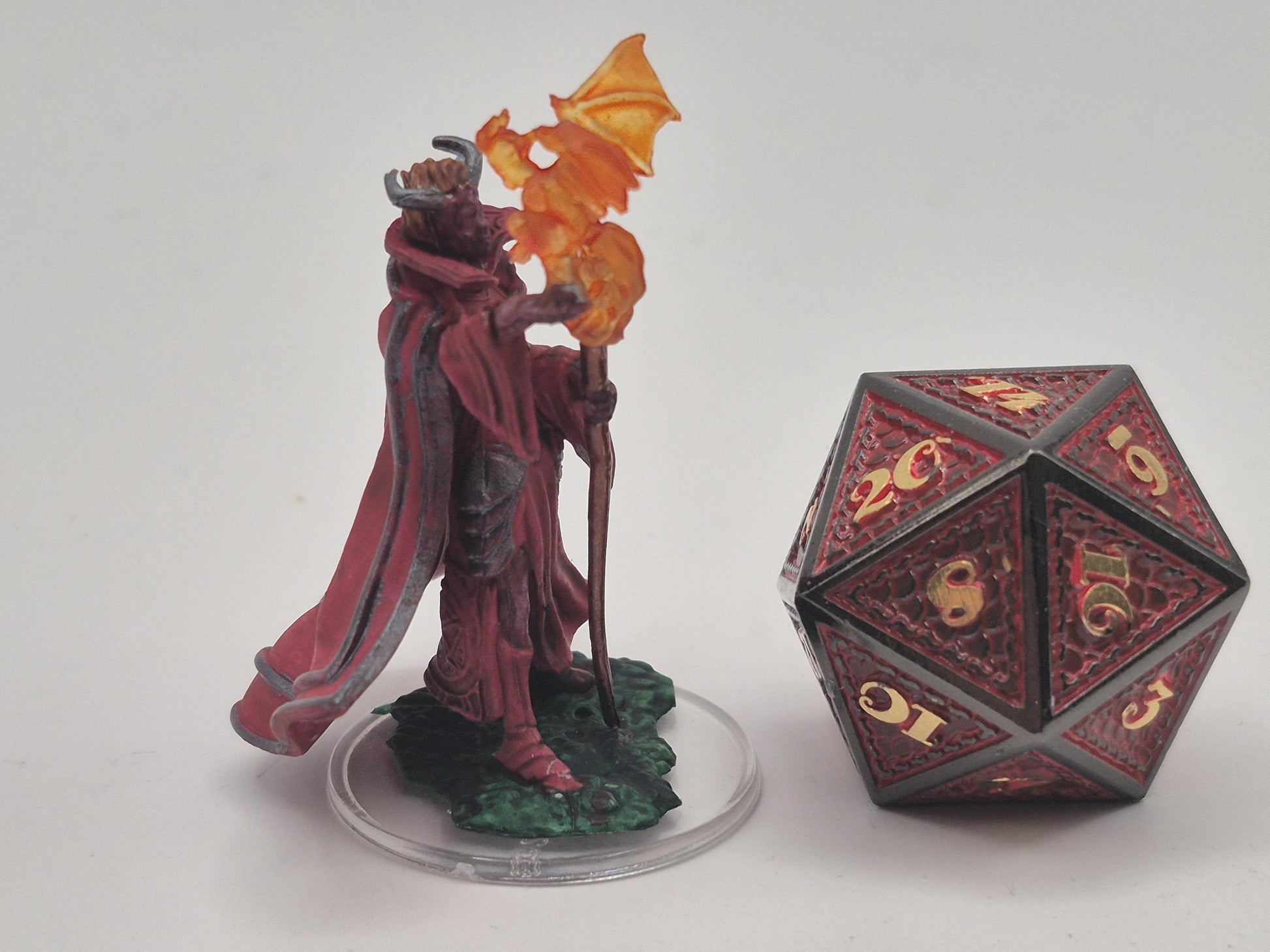 Draped in crimson robes and crowned with dark horns, this Cultist raises a staff crowned by a blazing, spectral dragon. With fire in his grip and devotion in his gaze, he channels forbidden power in service to a draconic master.