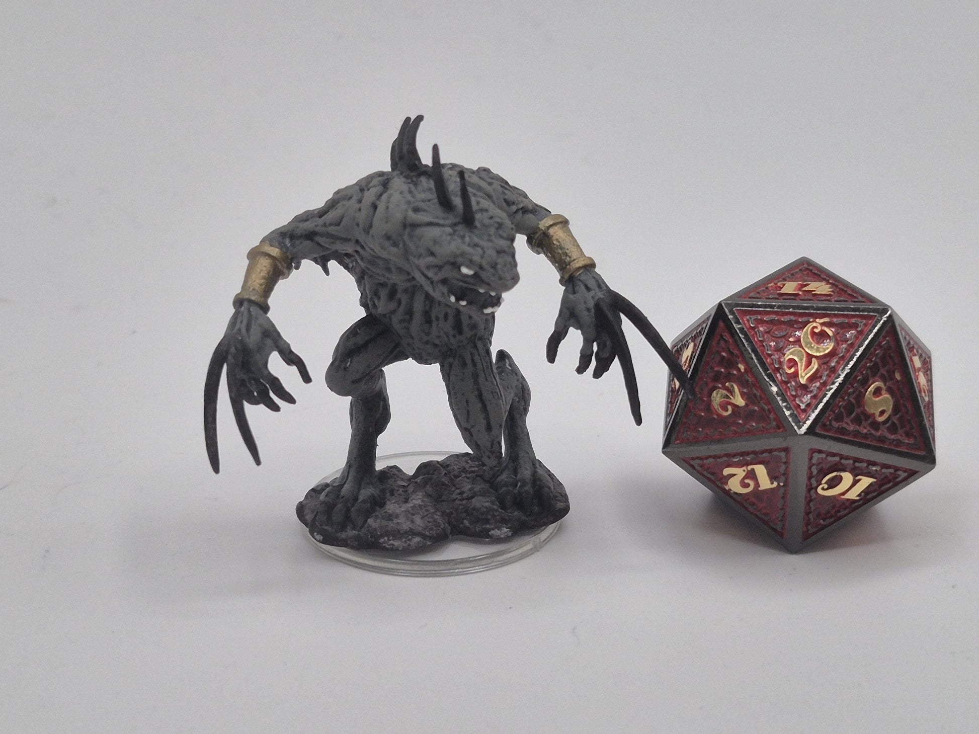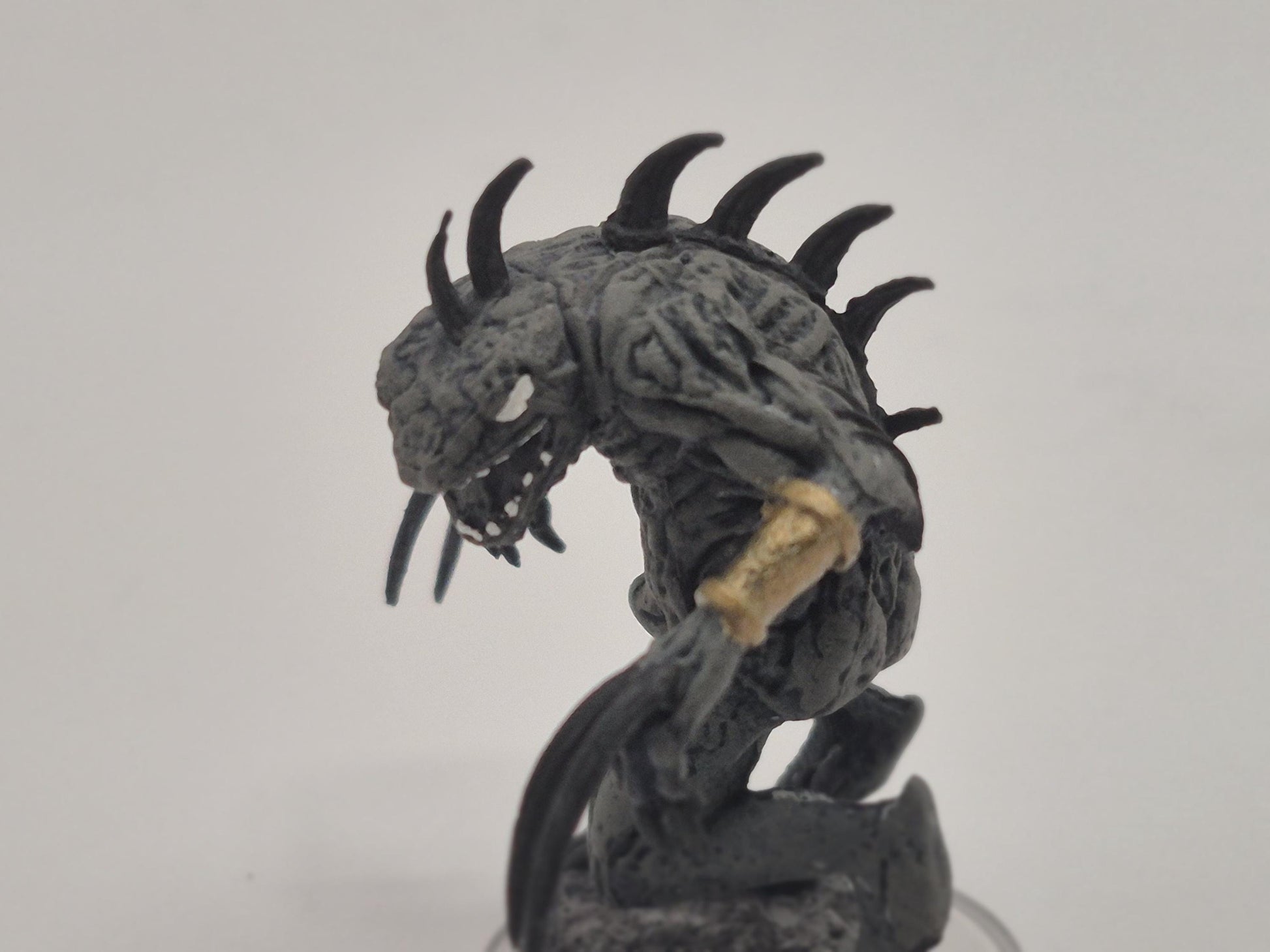 This towering Death Slaad looms with a gaunt, sinewy frame, its blackened claws and jagged spines exuding an aura of raw chaos. Adorned with golden arm bands that hint at dark rituals, it stalks its prey with an unholy blend of cunning and bloodthirsty ferocity.