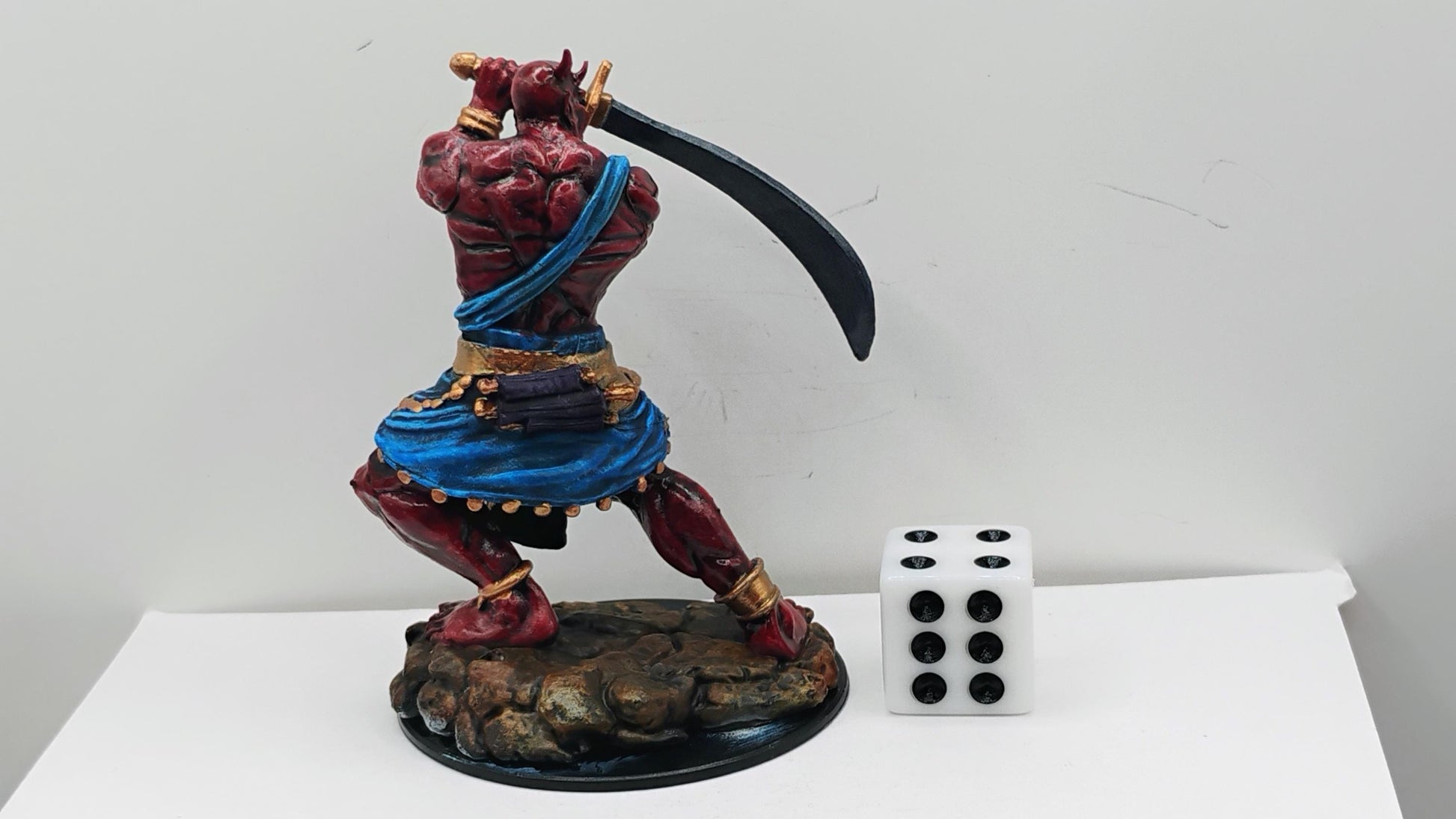 This fearsome Efreeti stands poised to strike, his muscular frame clad in gilded accents and flowing blue silks that swirl with elemental might. With his curved blade raised high, he embodies the wrath of flame and iron, ready to scorch all who oppose him.