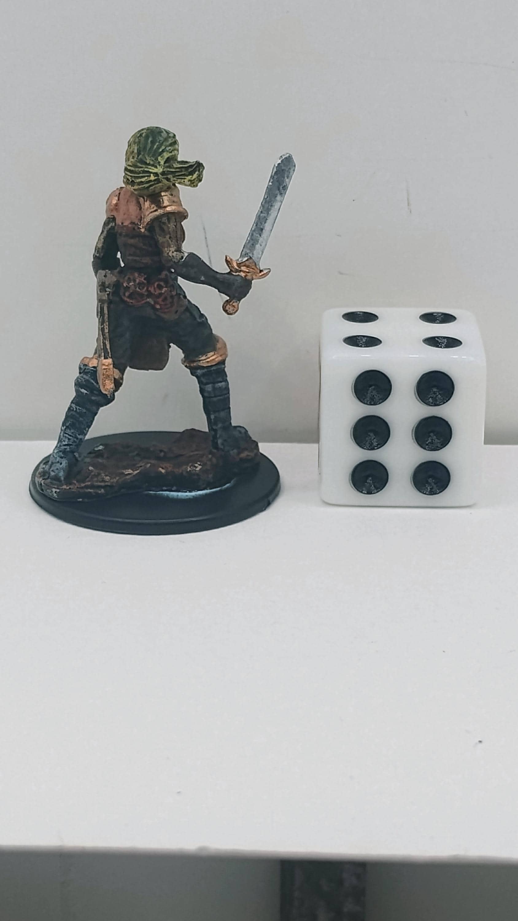 This Female Human Fighter stands bold and battle-ready, her sword raised and golden armor gleaming beneath a tattered green hood. With a stance of determination and weathered grace, she is a seasoned warrior forged by countless campaigns.