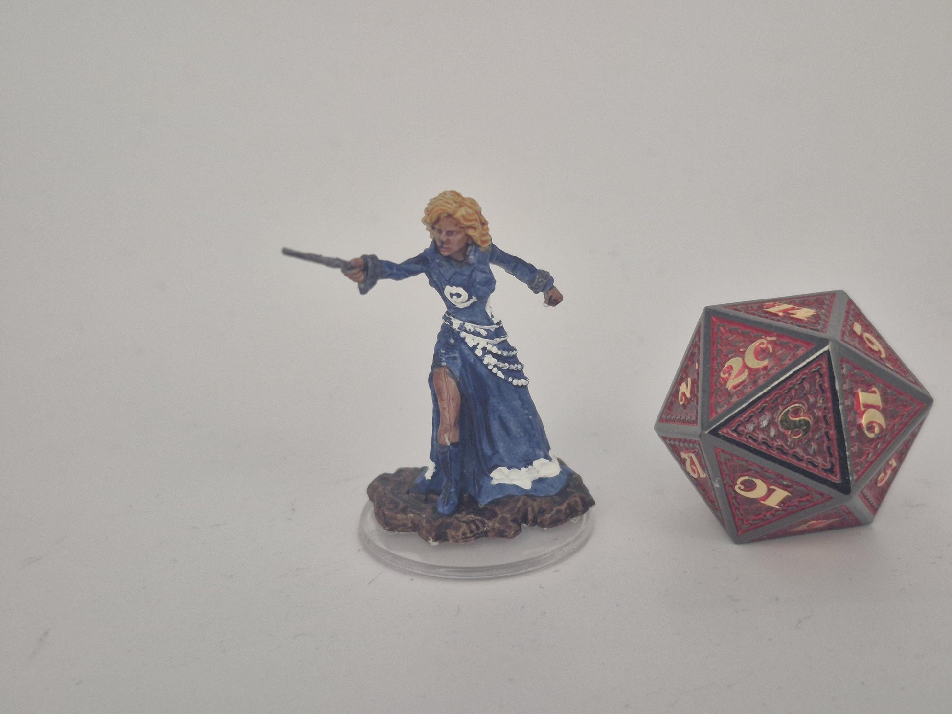 Clad in a flowing blue gown adorned with silver trim, this female Human Wizard channels arcane energy through her wand with poised precision. Her golden curls and fierce gaze belie the storm of magic she commands with a single whispered word.