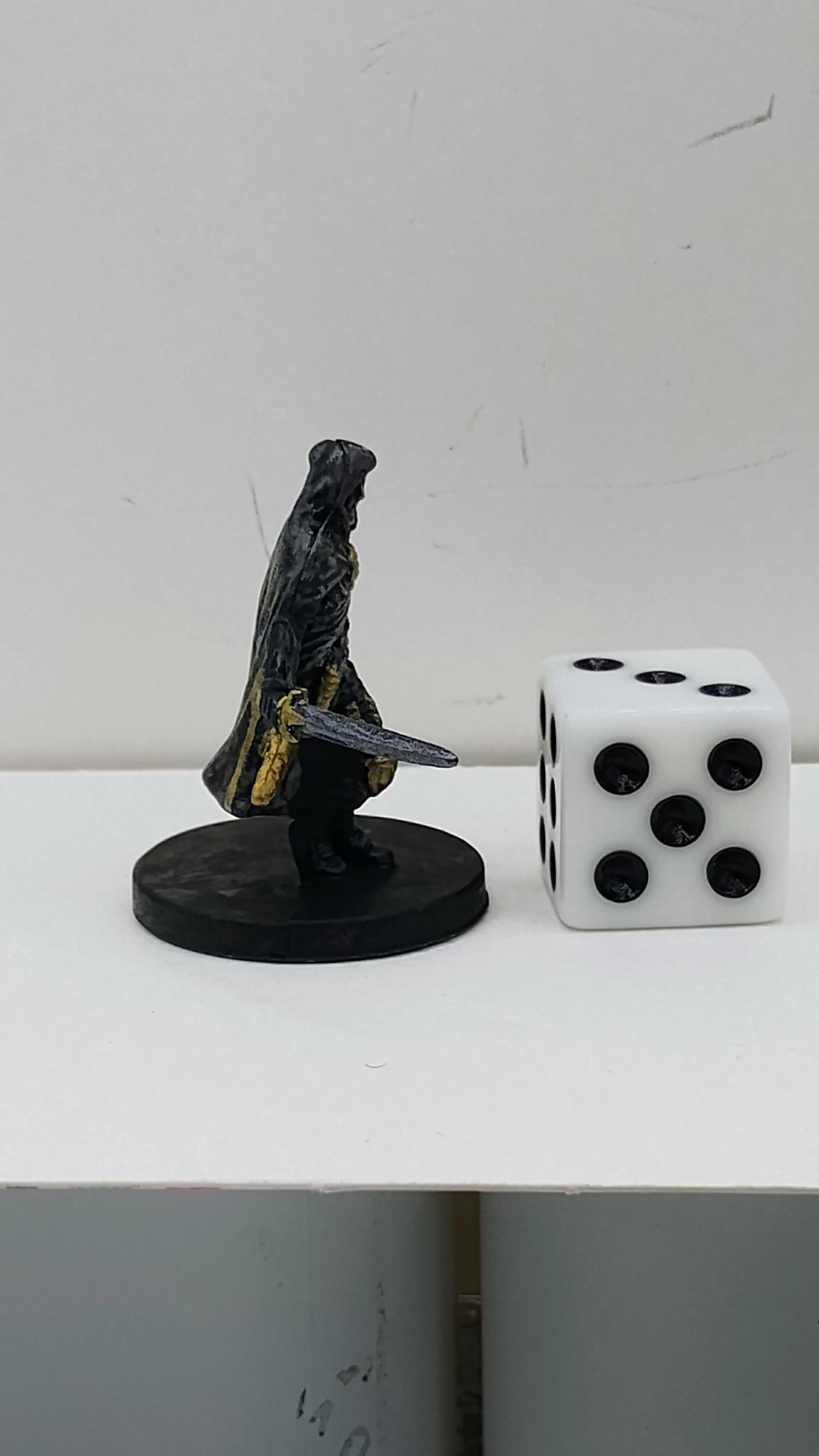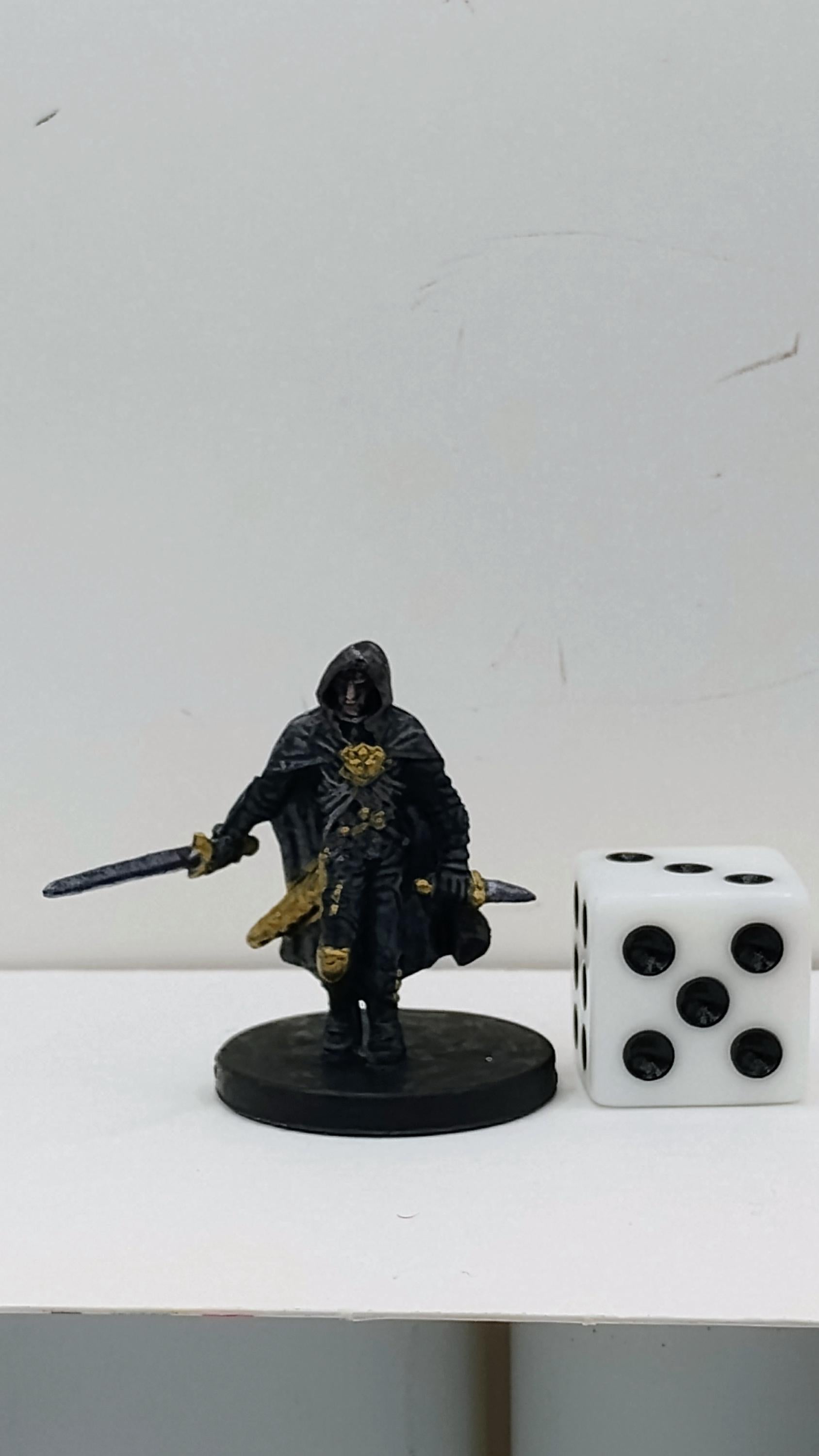 This Human Gray Guard moves with quiet menace, cloaked in black with gold accents and blades at the ready. His shadowed face and poised stance mark him as a deadly enforcer of silent orders and hidden agendas.