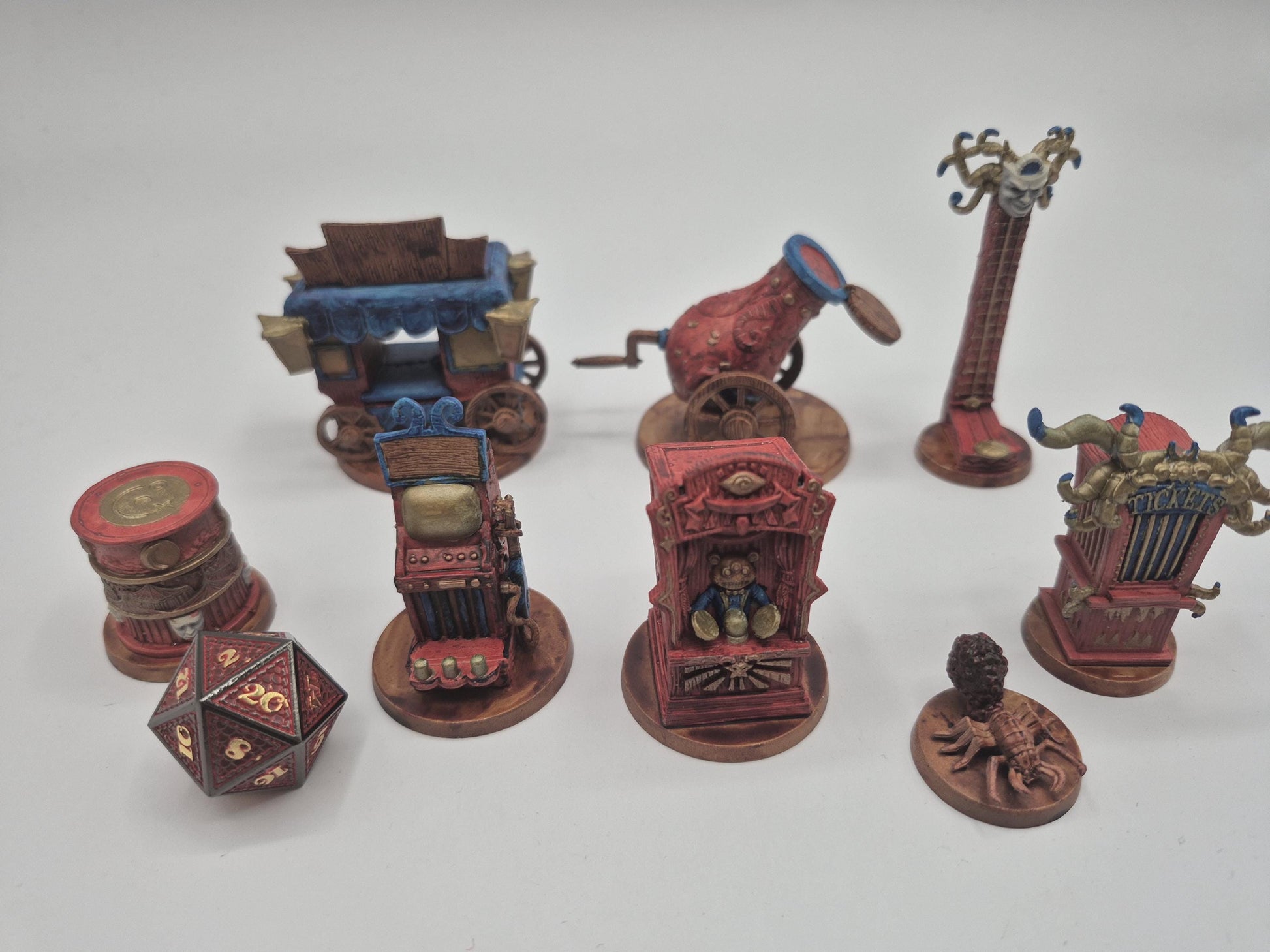Heckna Props a plenty Set - 8 Pieces - Arcade Machine, Cannon, Fortune Teller, Podium Base, Popcorn Cart, , Strength Test, Ticket Booth, Schnozling