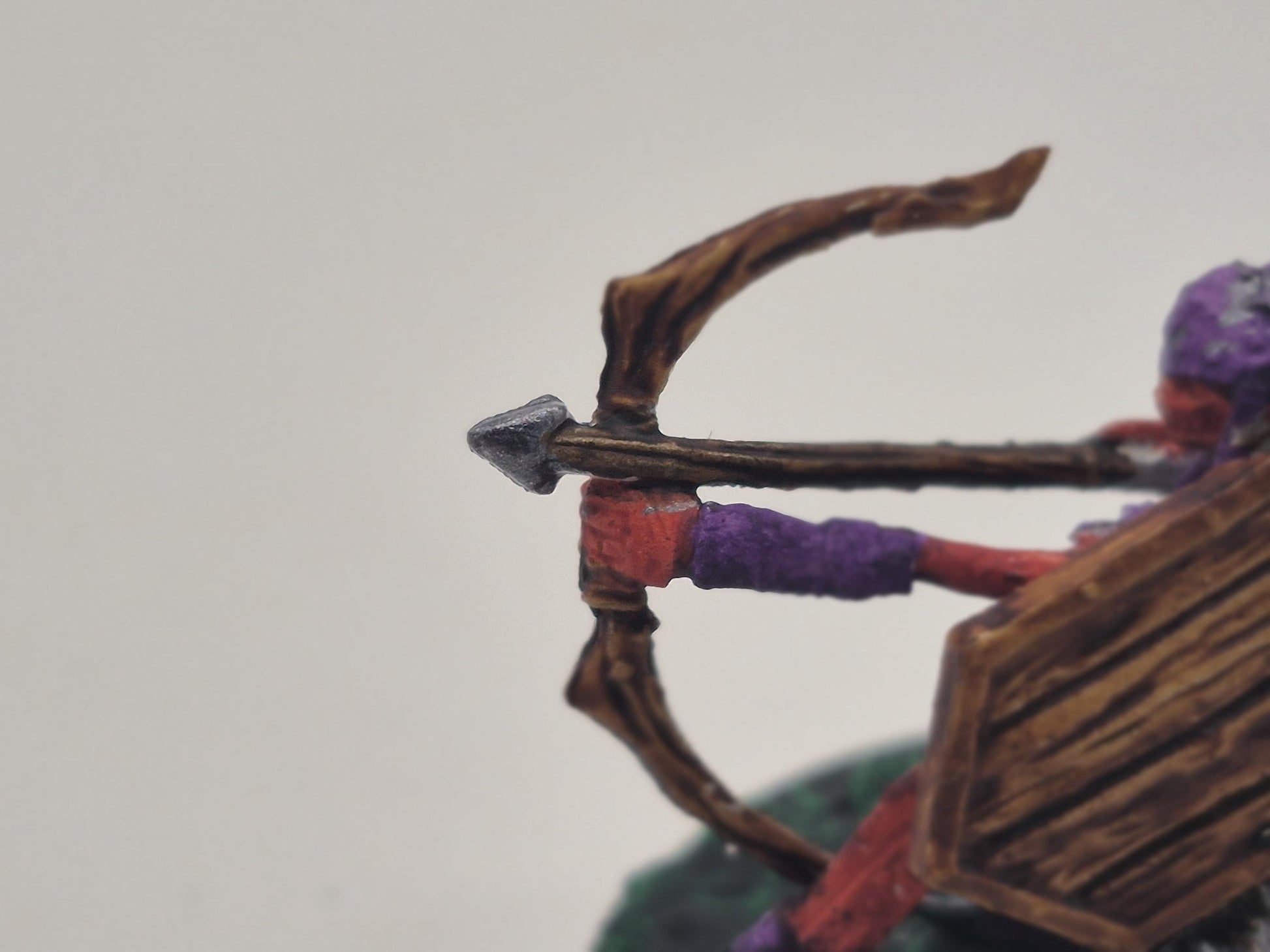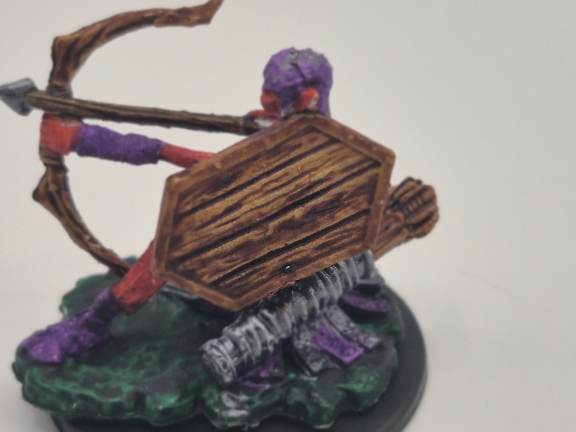 Crouched behind his wooden shield, this Hobgoblin archer draws his bow with ruthless discipline and steady aim. Clad in war-worn purple and iron, he fights not for glory-but for the order and conquest of his legion.