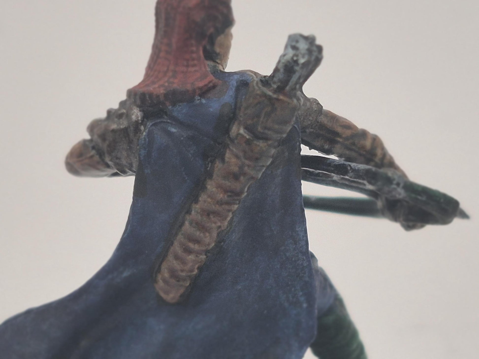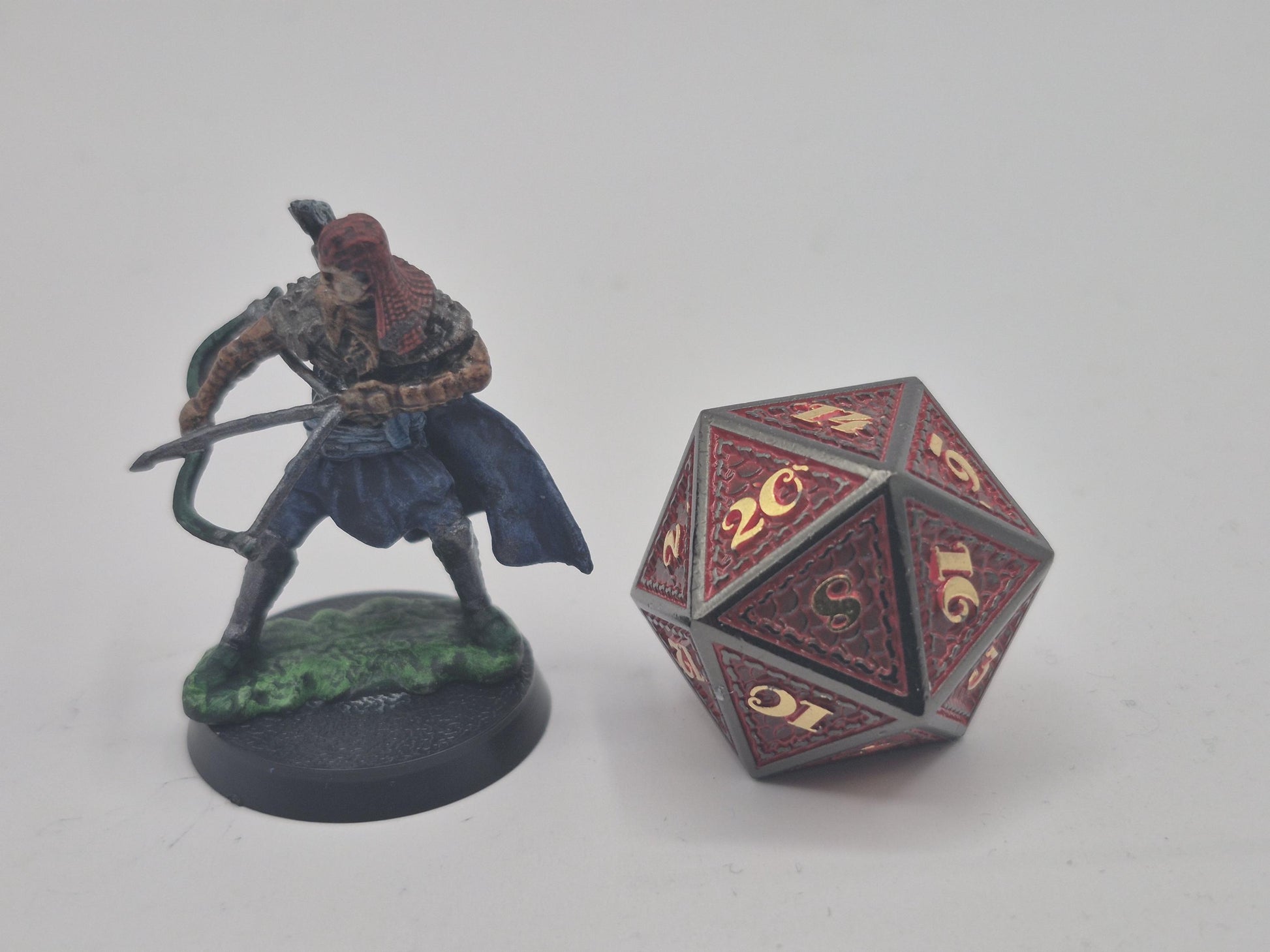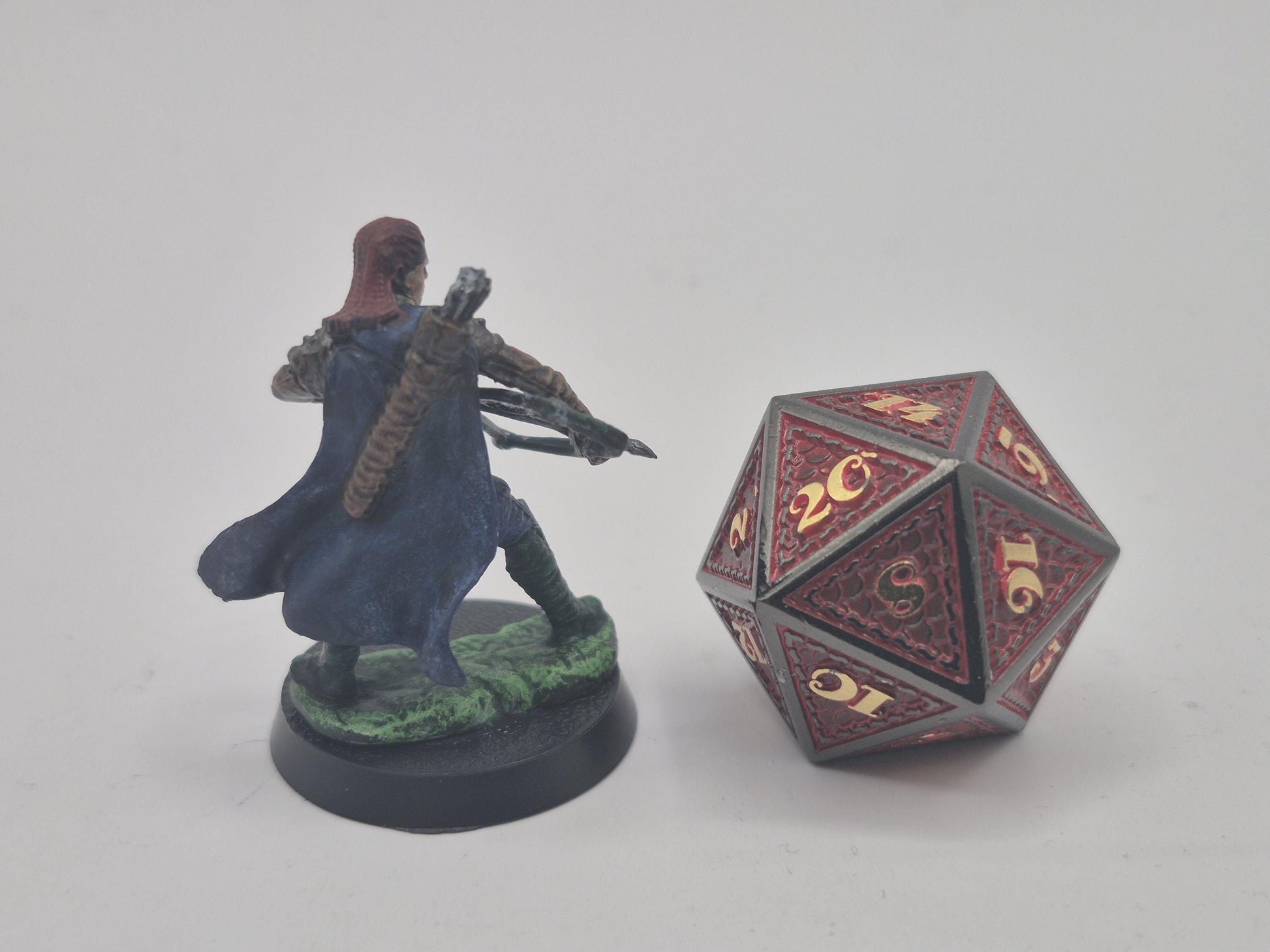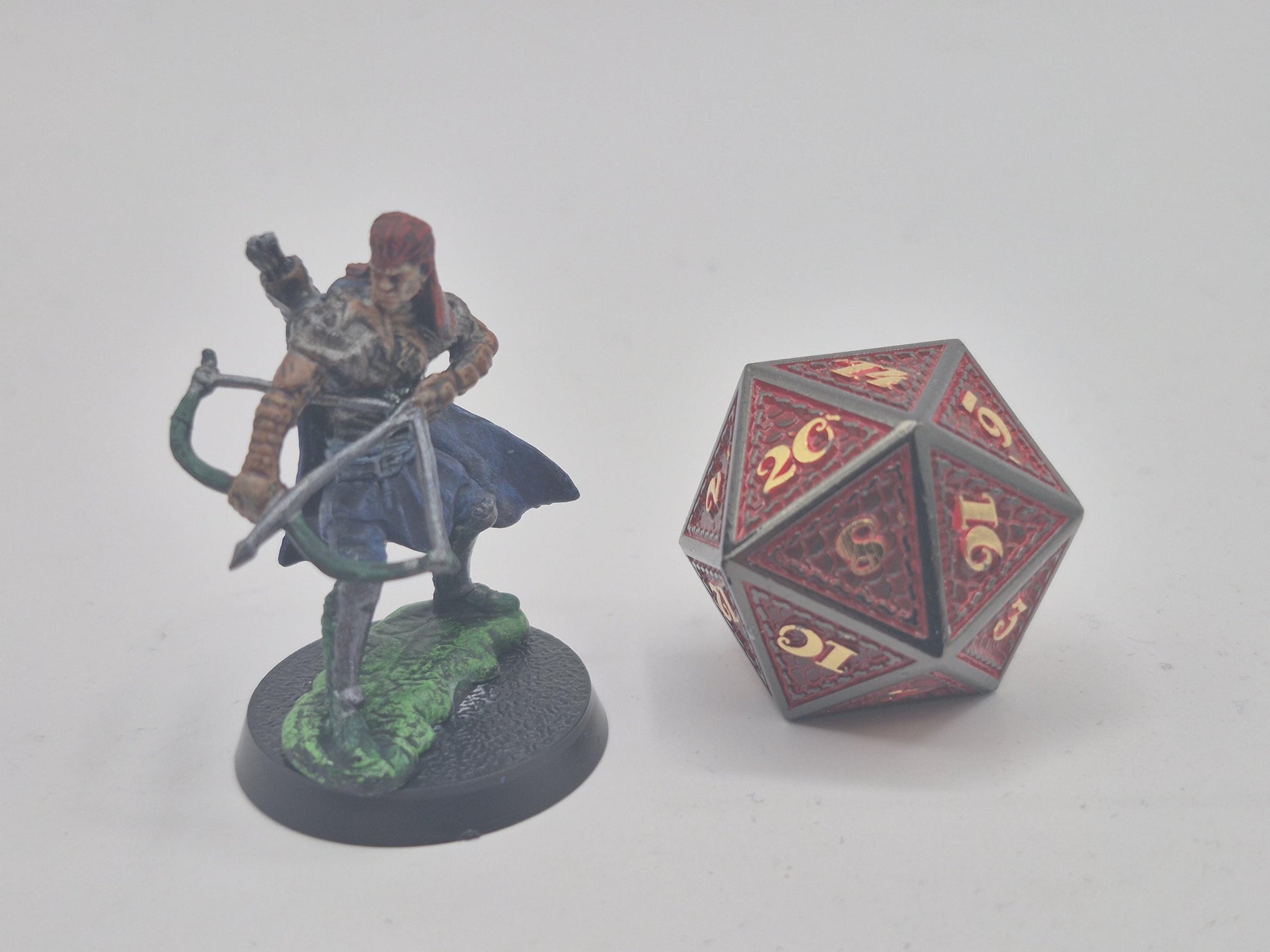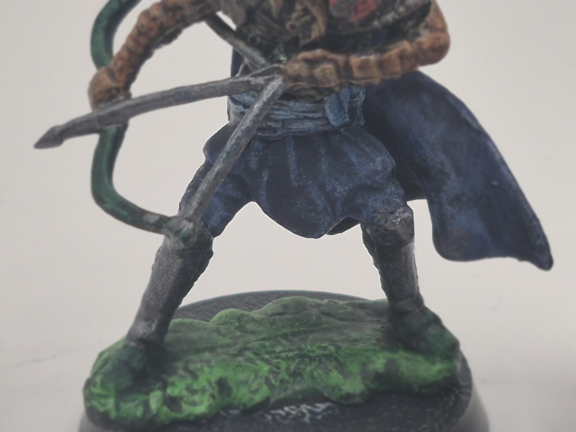This human archer nocks an arrow with calm determination. His curved green bow and battle-worn gear speak of a life spent tracking prey through forest and field.