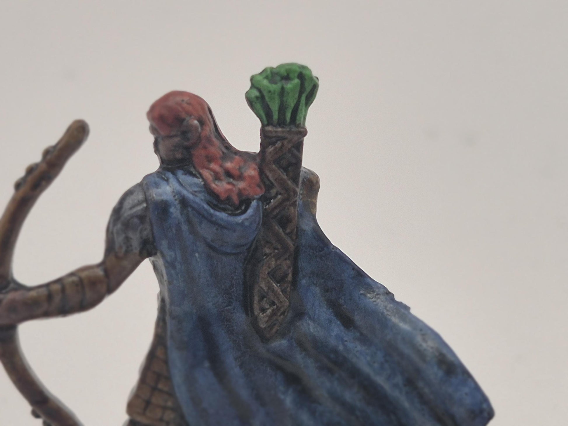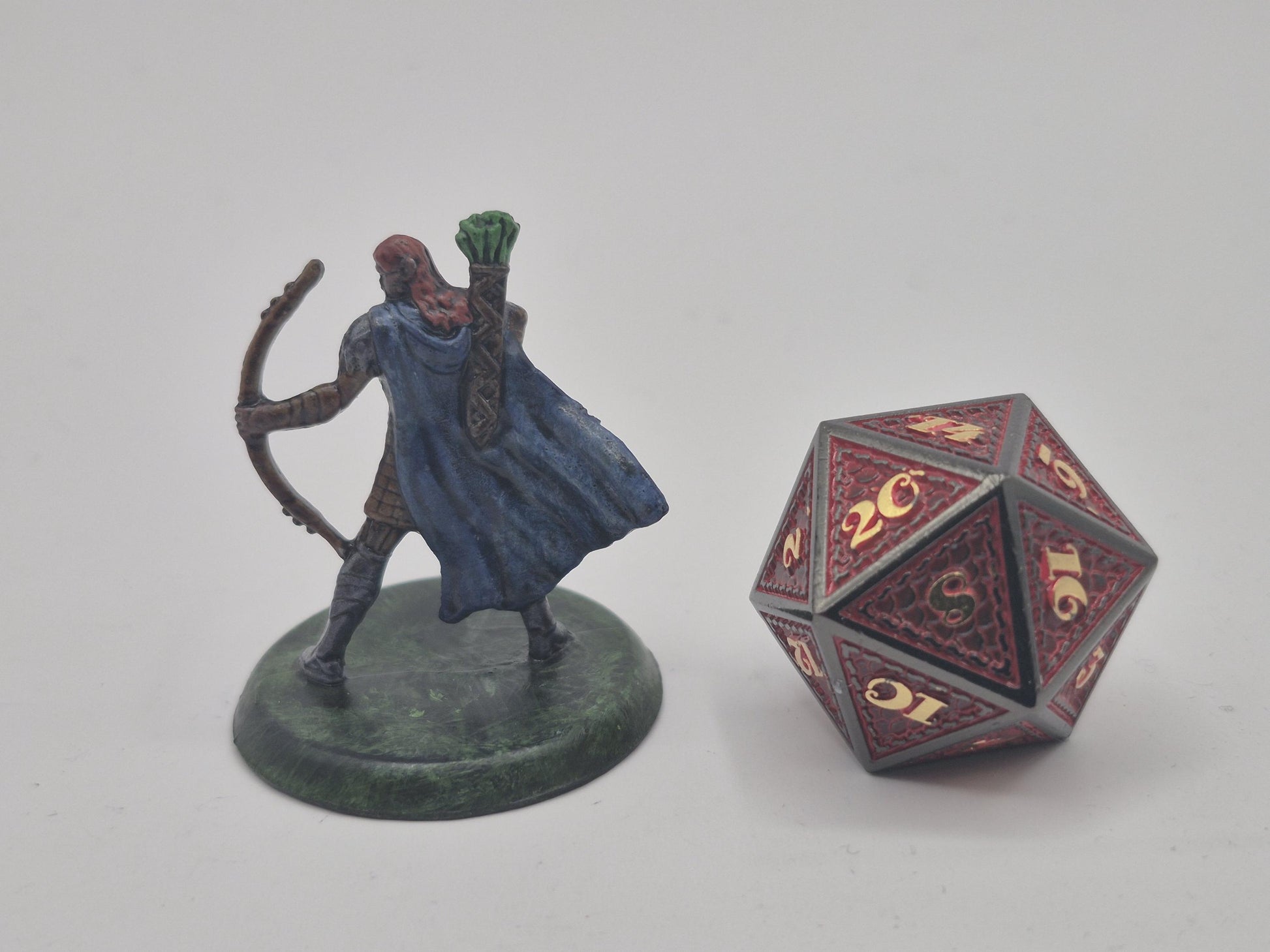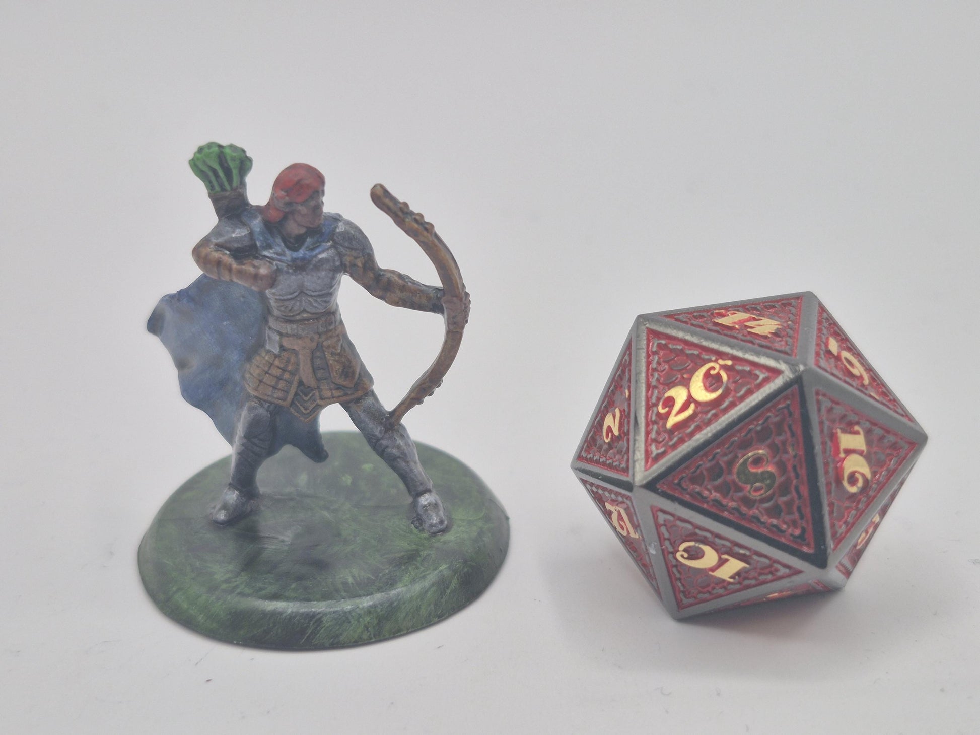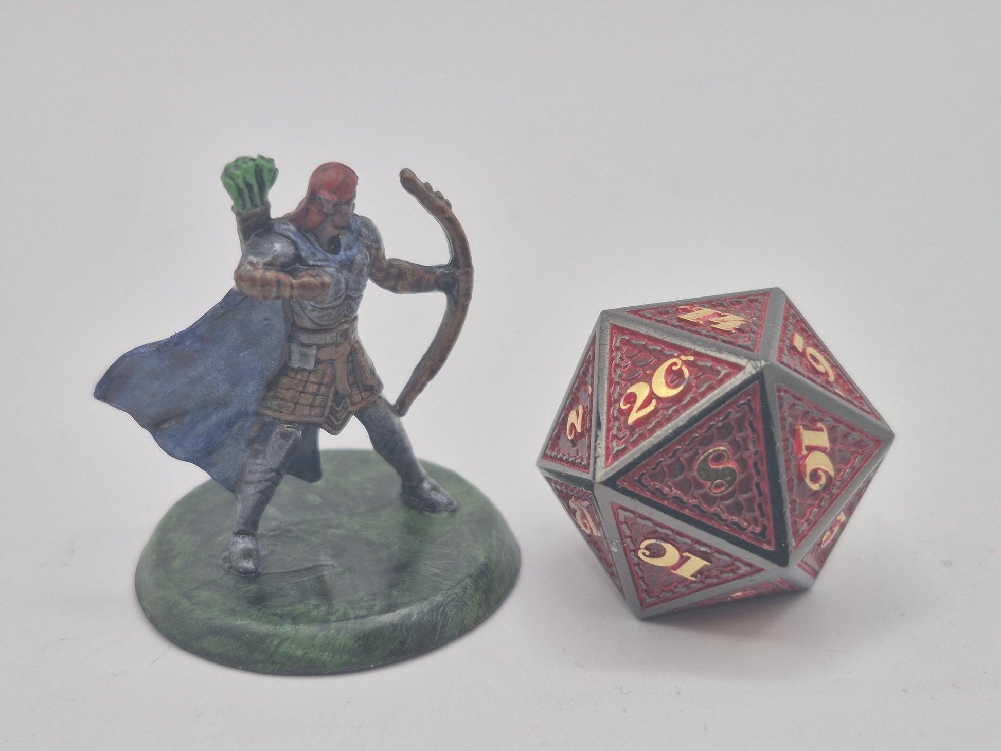 With crimson hair flowing behind gleaming armor, this human archer strikes a heroic pose, bow raised and eyes locked on the distance. A quiver of vivid green-fletched arrows and a sweeping blue cloak mark them as a seasoned warrior of honor and precision.
