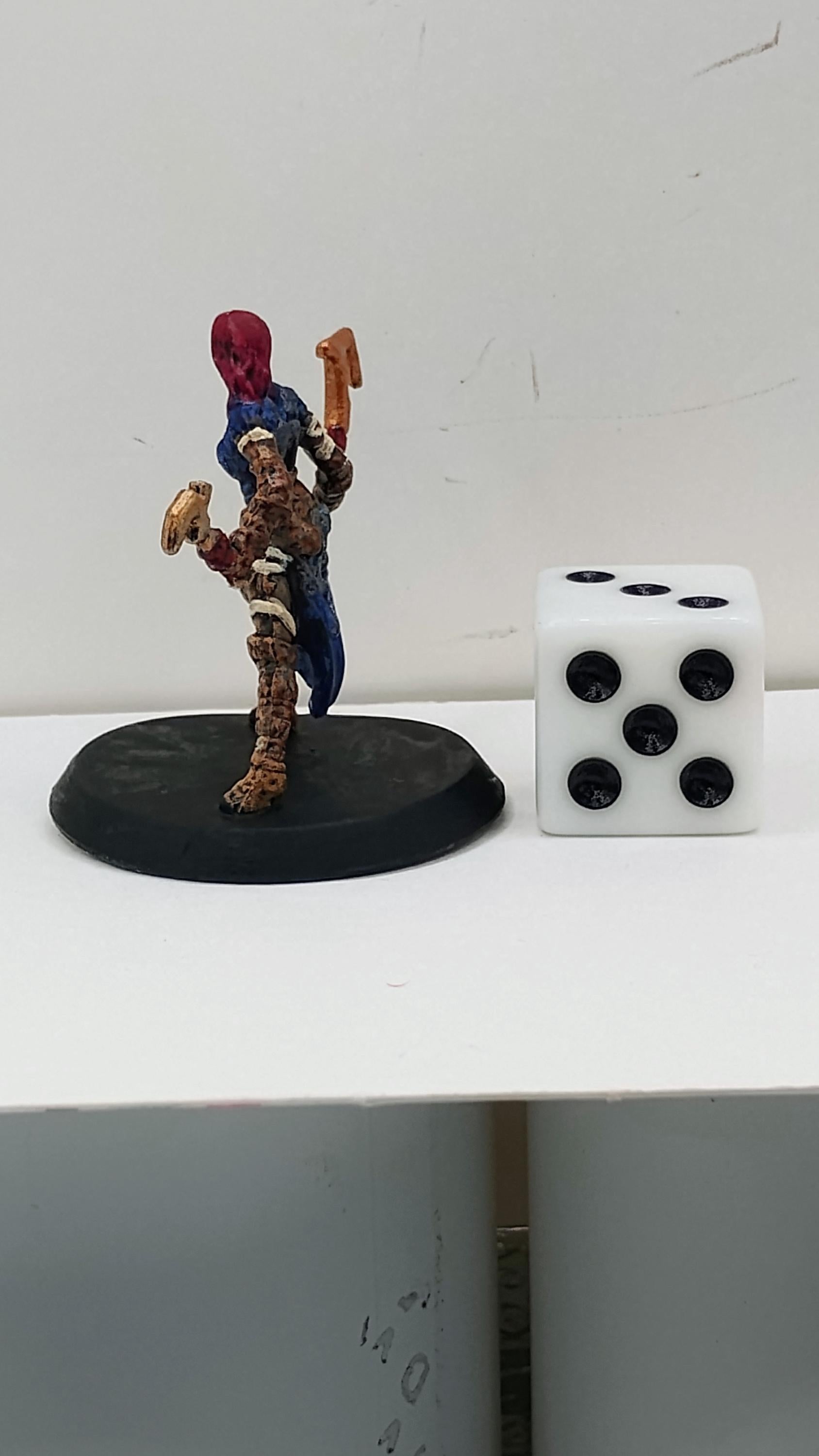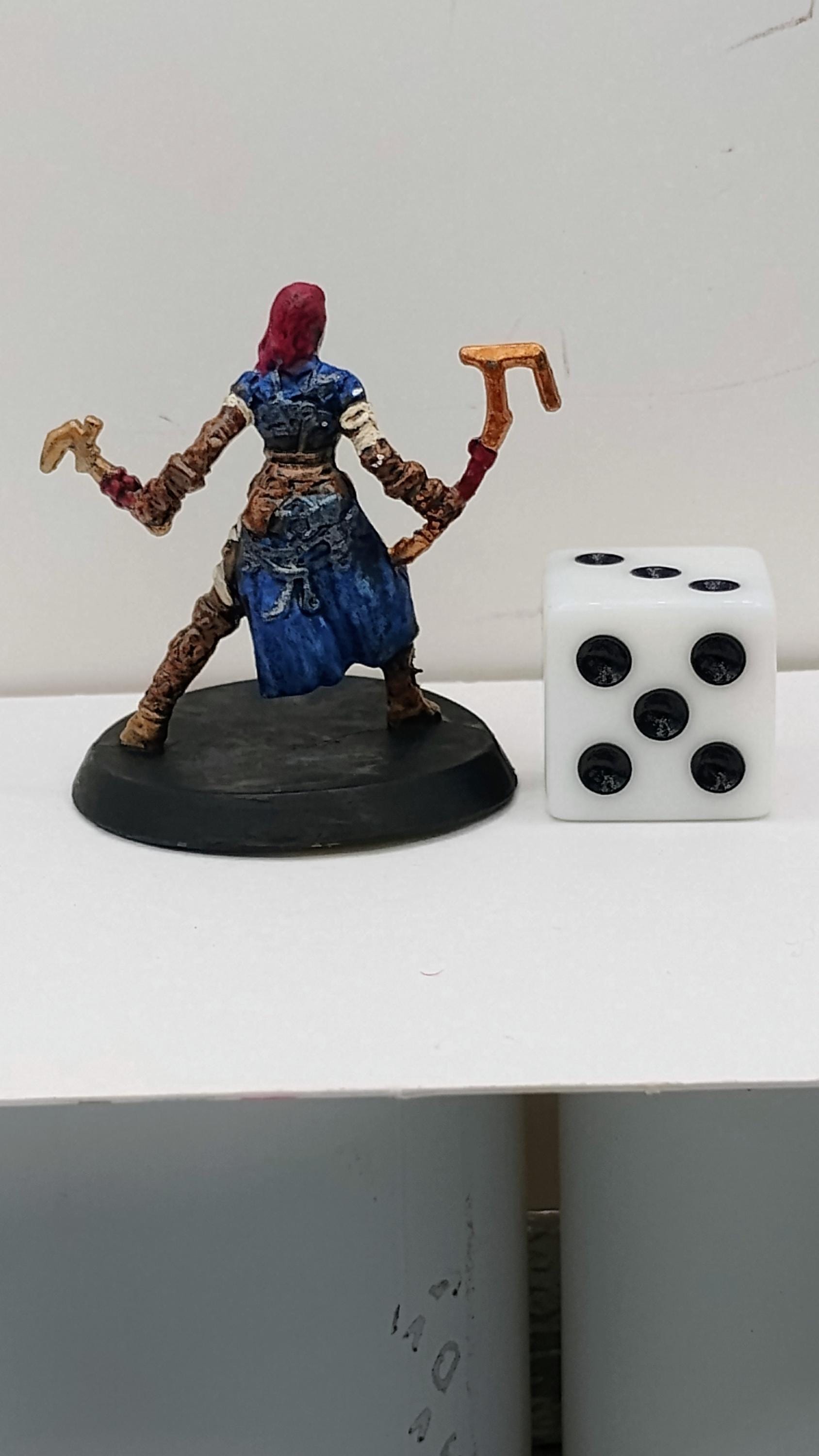 This Human Hookmaster strikes a fierce pose, crimson hair flowing as she wields twin golden hooks with deadly grace. Dressed in rugged armor and a bold blue tunic, she is a swift and merciless close-combat specialist.