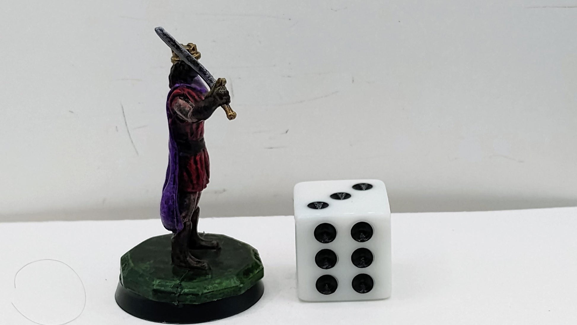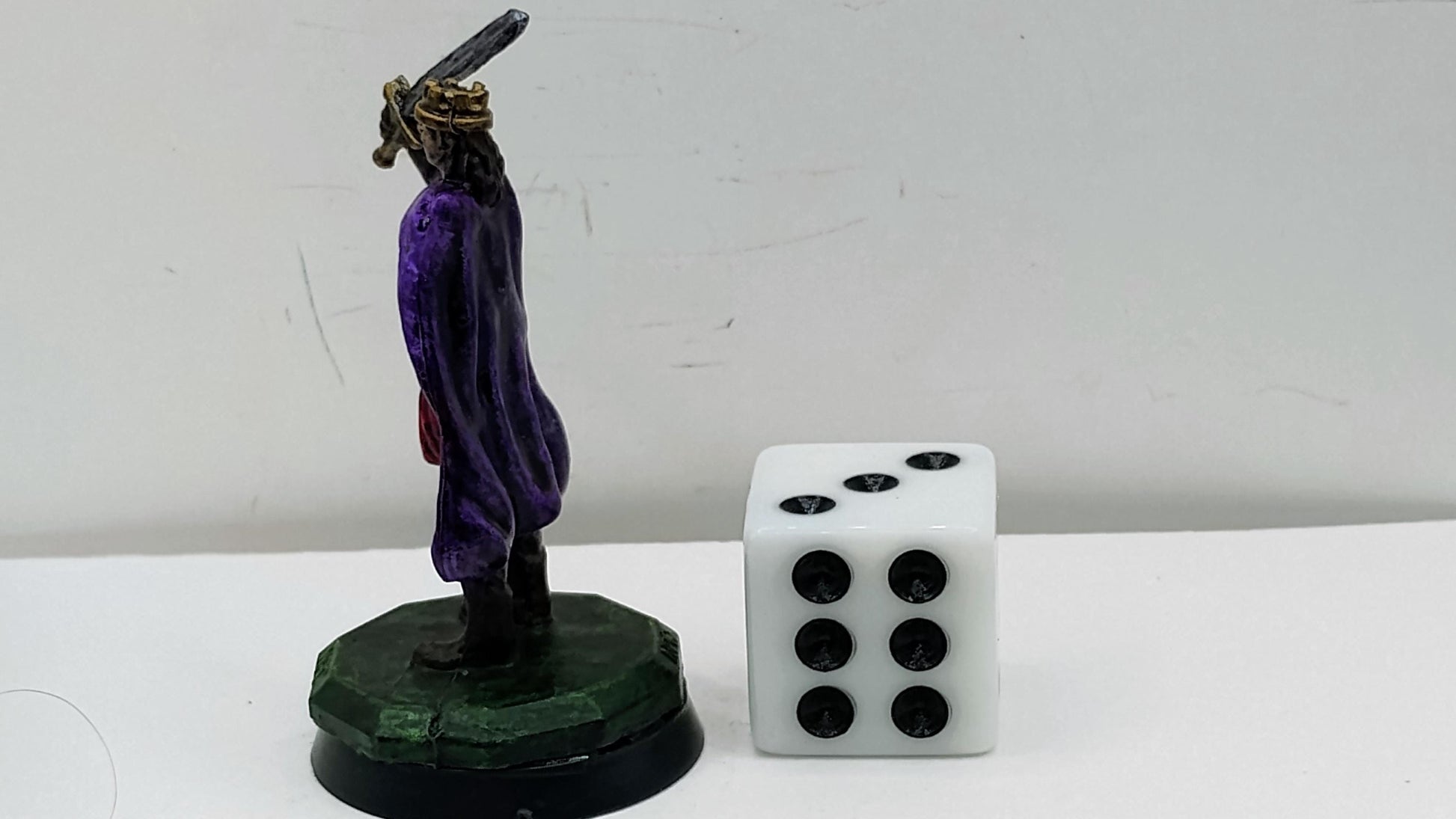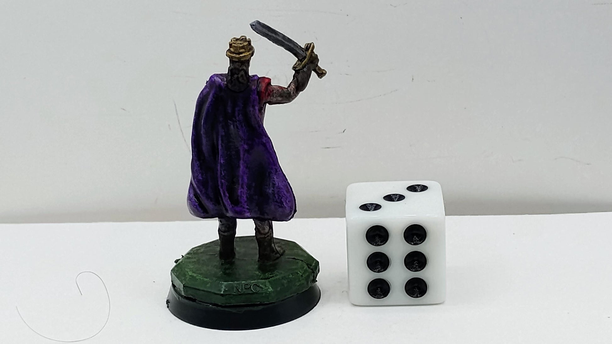 Clad in regal red and bearing a golden crown, this Human King raises his sword high, ready to defend his realm with unwavering authority. His flowing purple cloak trails behind him, symbolizing royal power and noble command.
