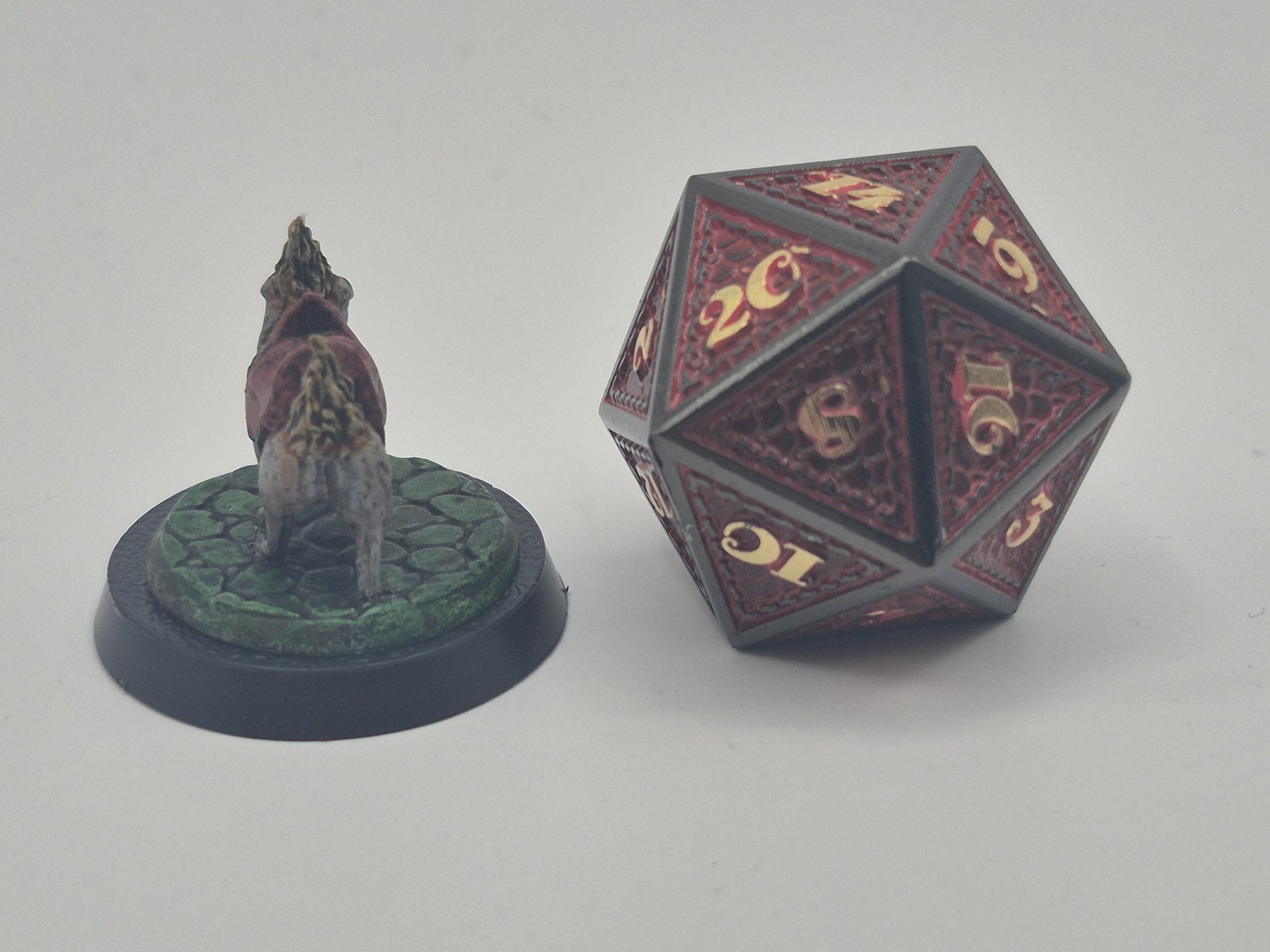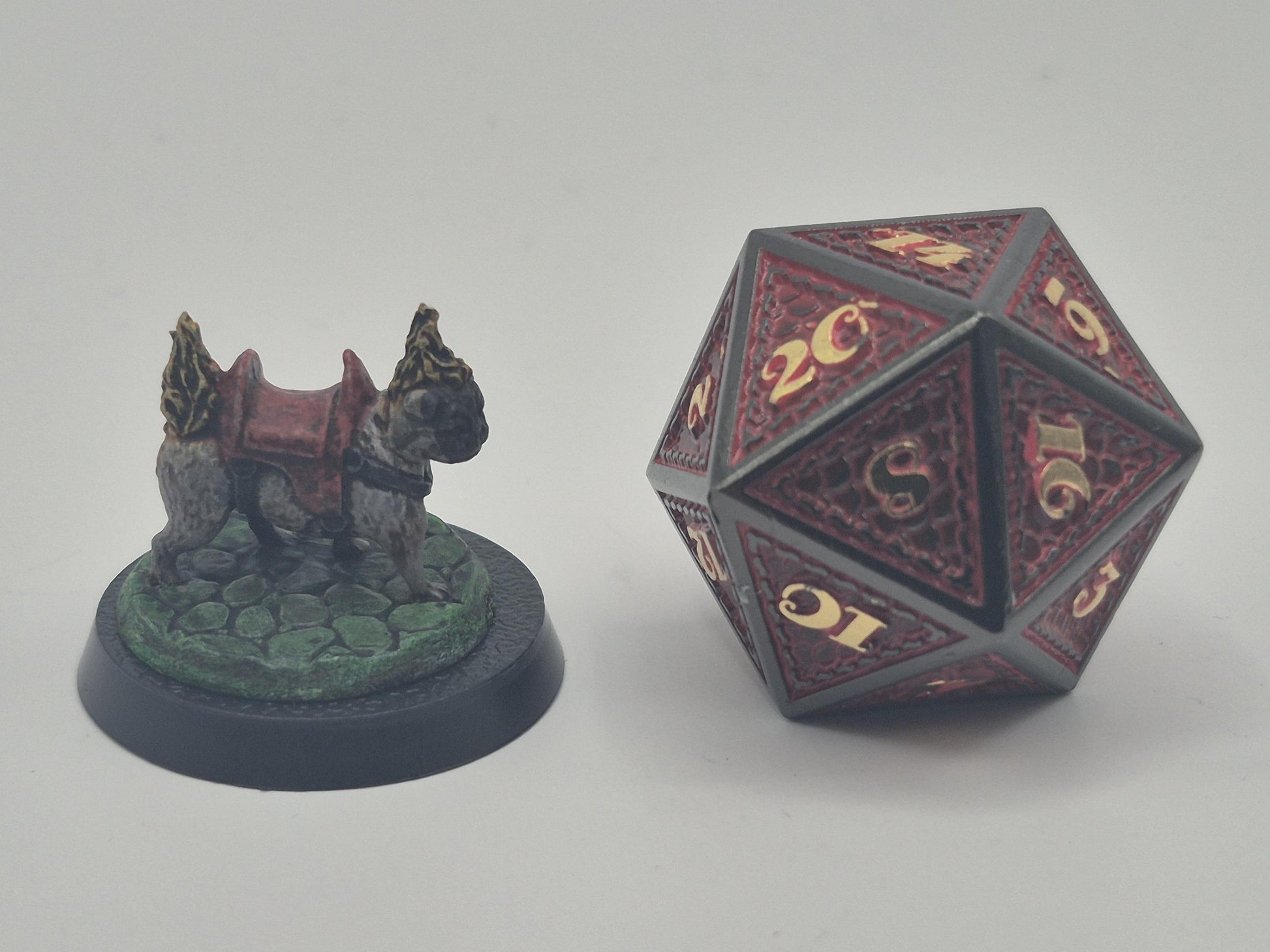 This flaming-furred Hell Pug snarls with glowing red eyes and trots proudly across a scorched cobblestone base. Cloaked in a red infernal saddle, it serves as both companion and blazing mount to the damned.