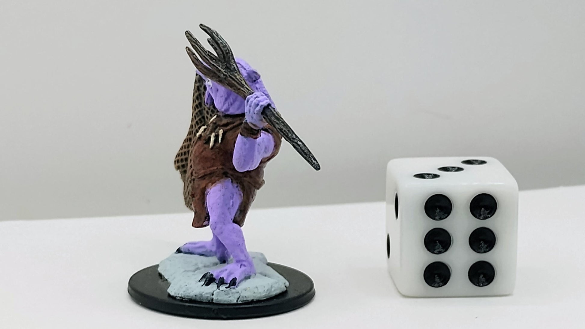 This snarling Kuo-Toa brandishes a crude trident and a heavy net, ready to ensnare surface dwellers in its web of madness. Draped in rough leathers and adorned with bone charms, it serves as a relentless scout for its aquatic kin.