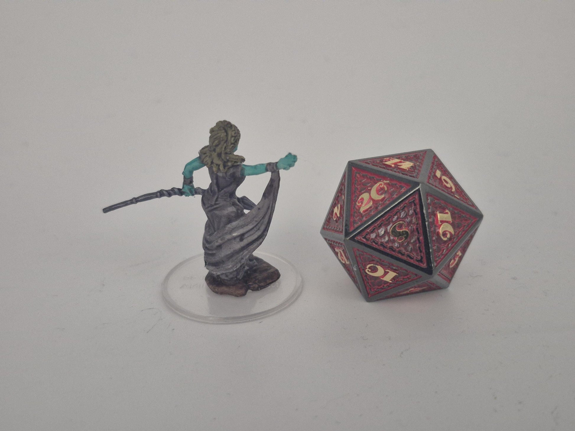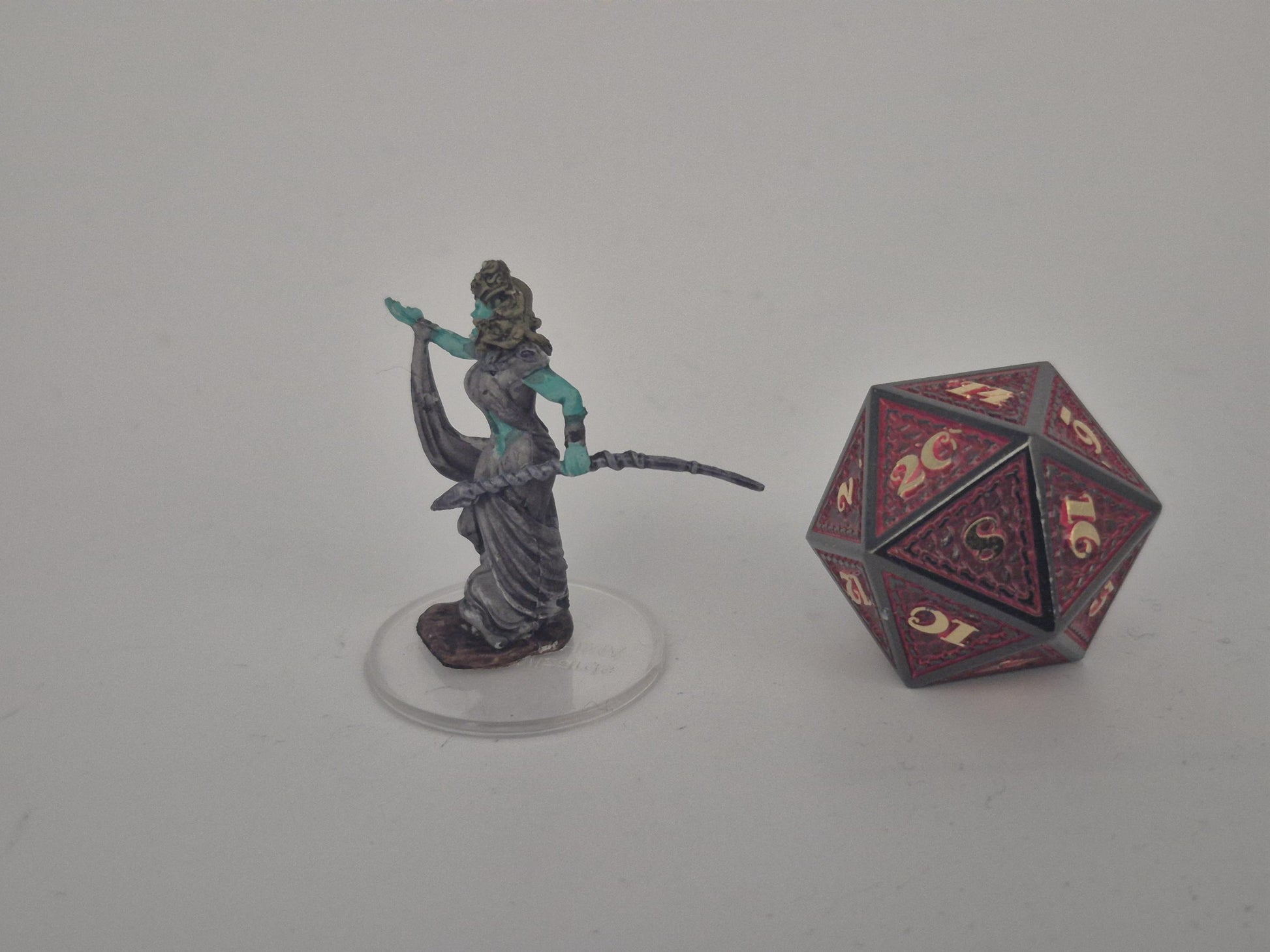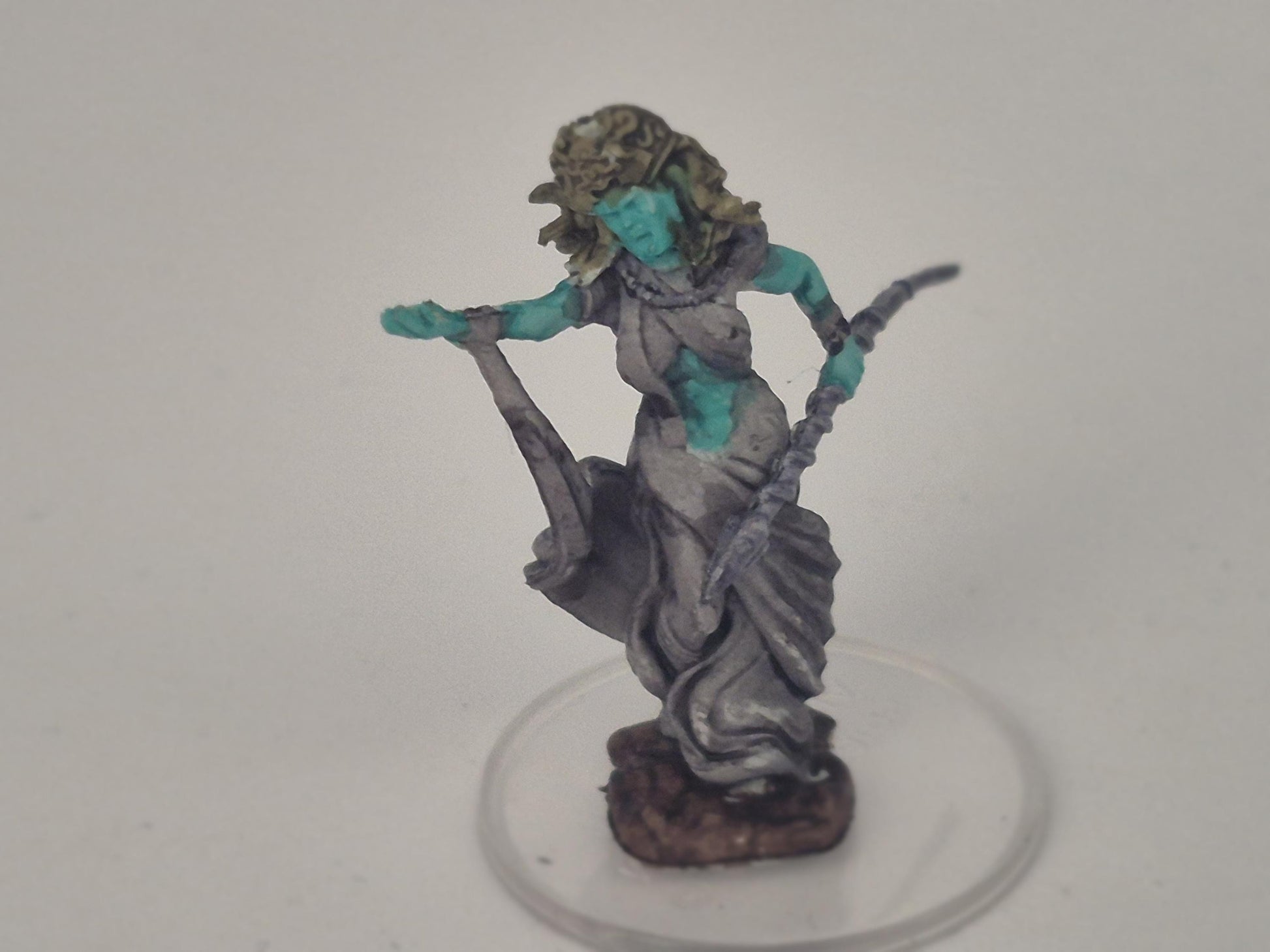 This elegant yet terrifying Medusa strides forward with serpentine grace, her turquoise skin glowing and her hair writhing with sculpted snakes. Draped in flowing robes and armed with a curved blade, she lures victims into her gaze with an eerie, hypnotic allure.