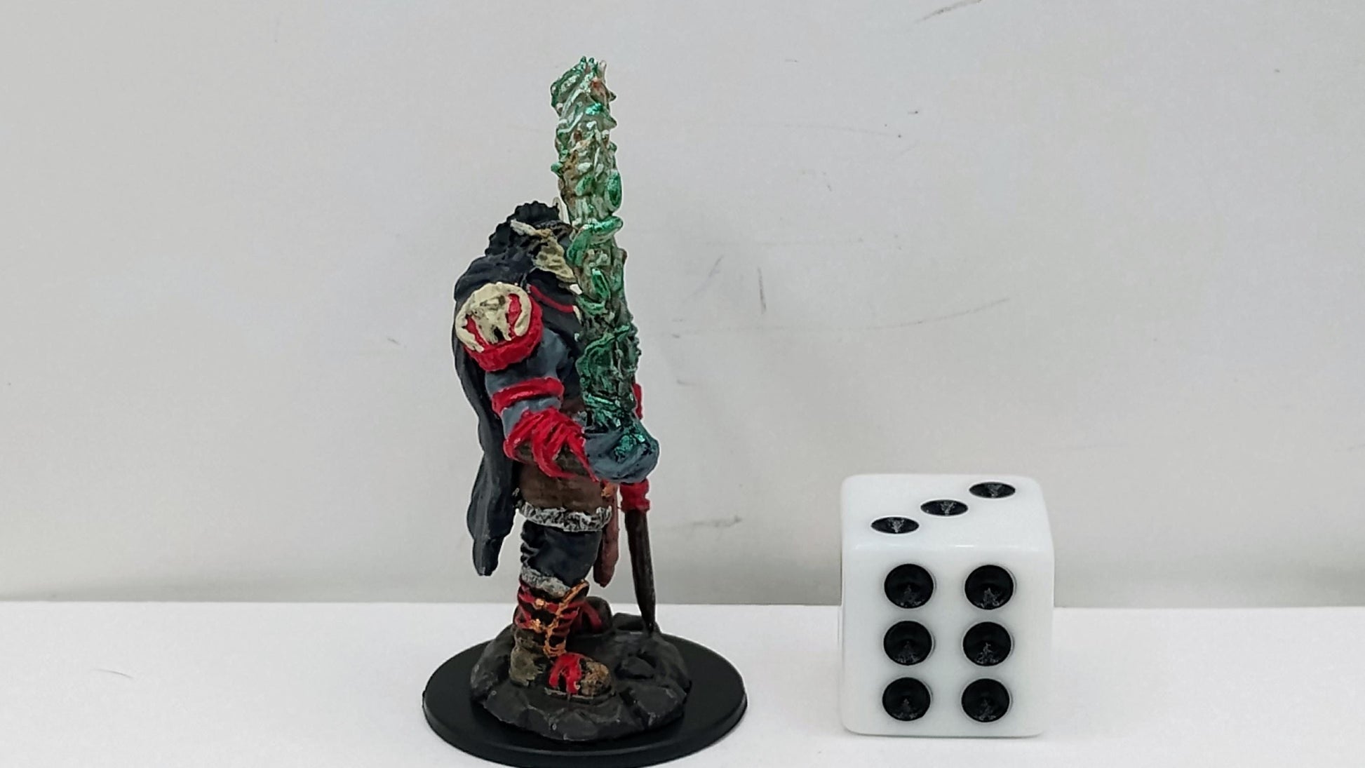 This orc adventurer channels primal energy through a twisted, living staff crowned with arcane foliage. Cloaked in dark cloth and ritual bone charms, he stands as both a mystic and warrior of the wild frontier.