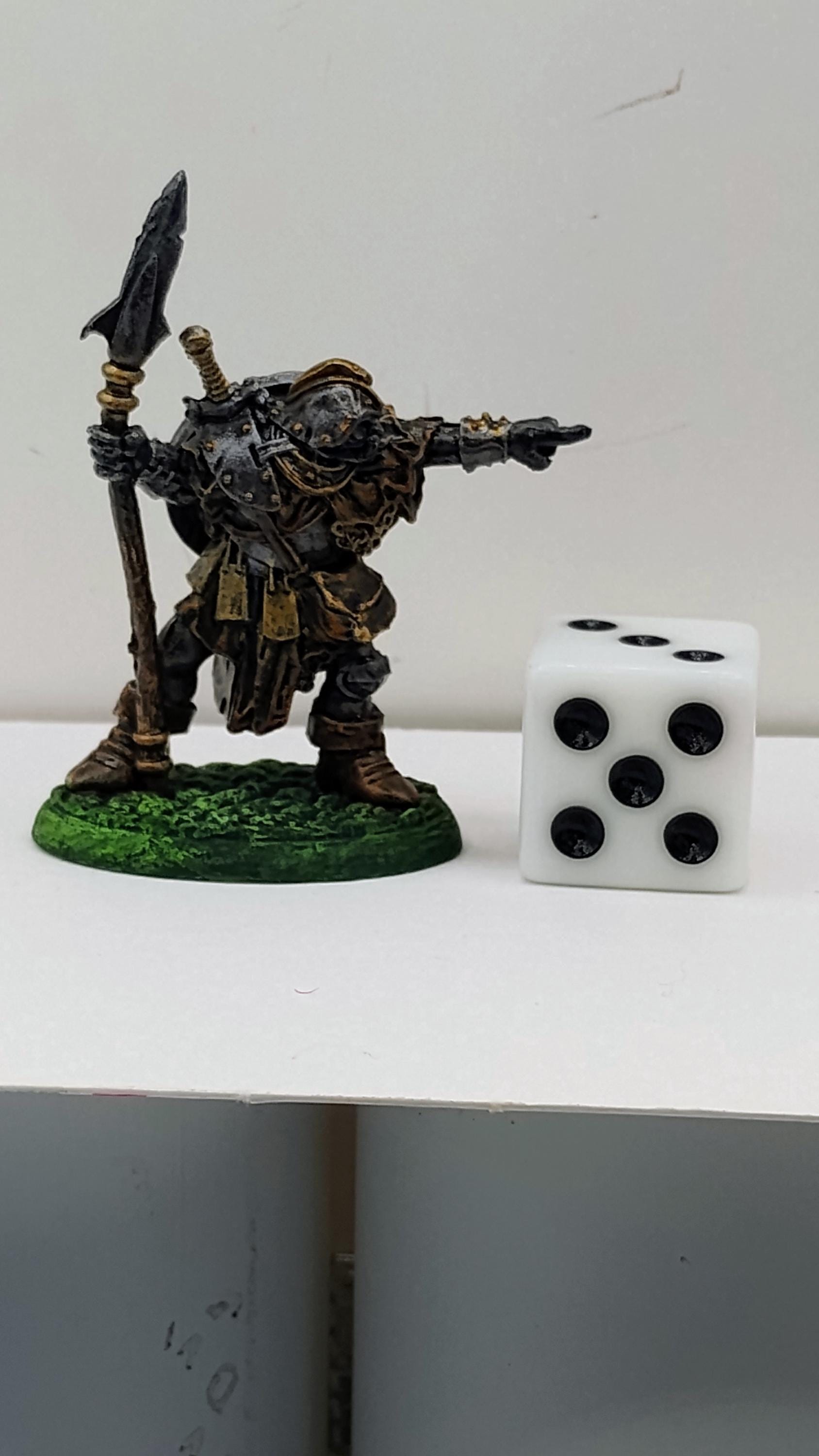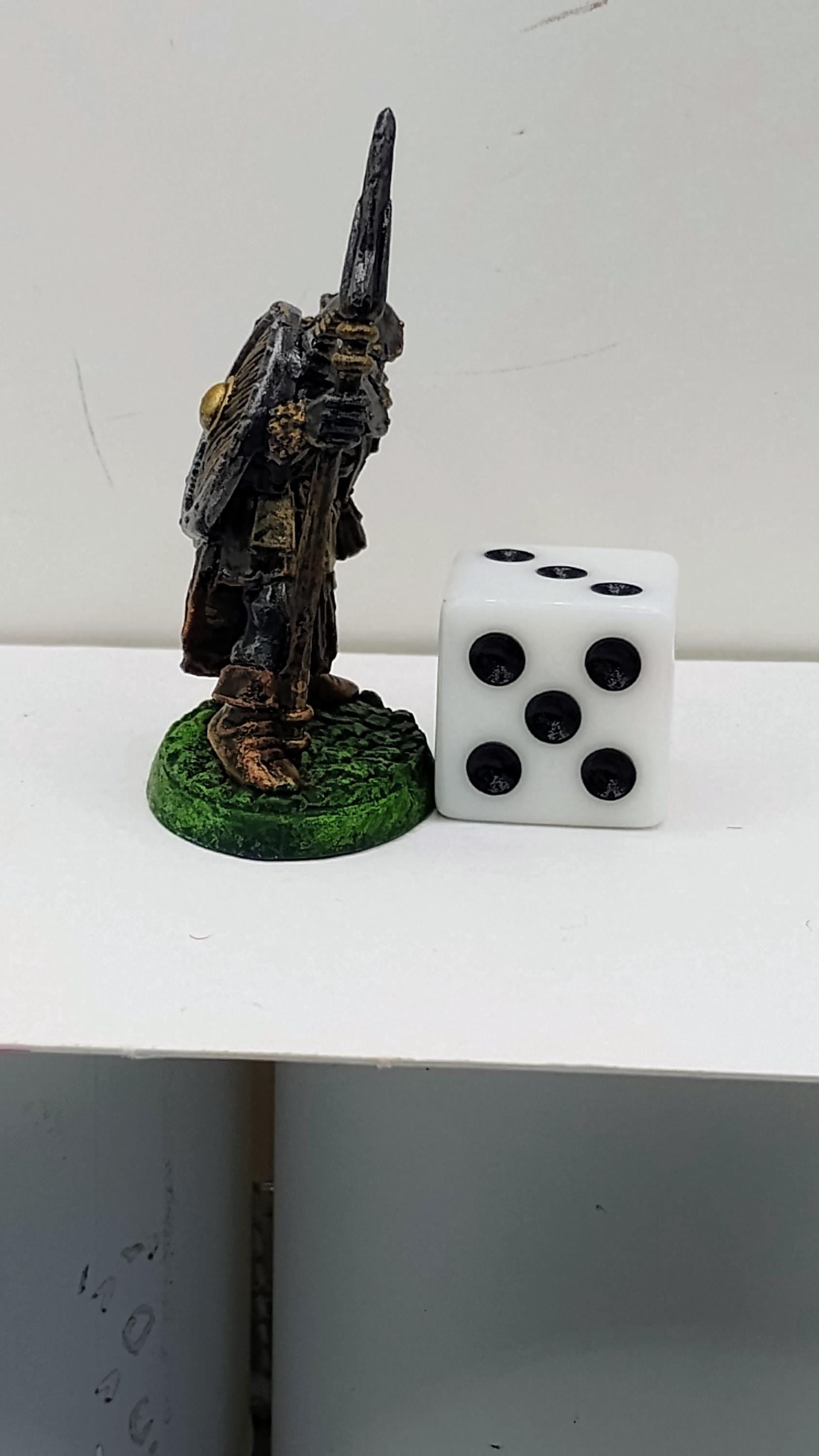 This orc leader stands tall and grim, cloaked in dark armor with gold accents and a weathered shield strapped to his back. His massive sword is held high in silent command, a symbol of dominance forged through countless brutal victories.