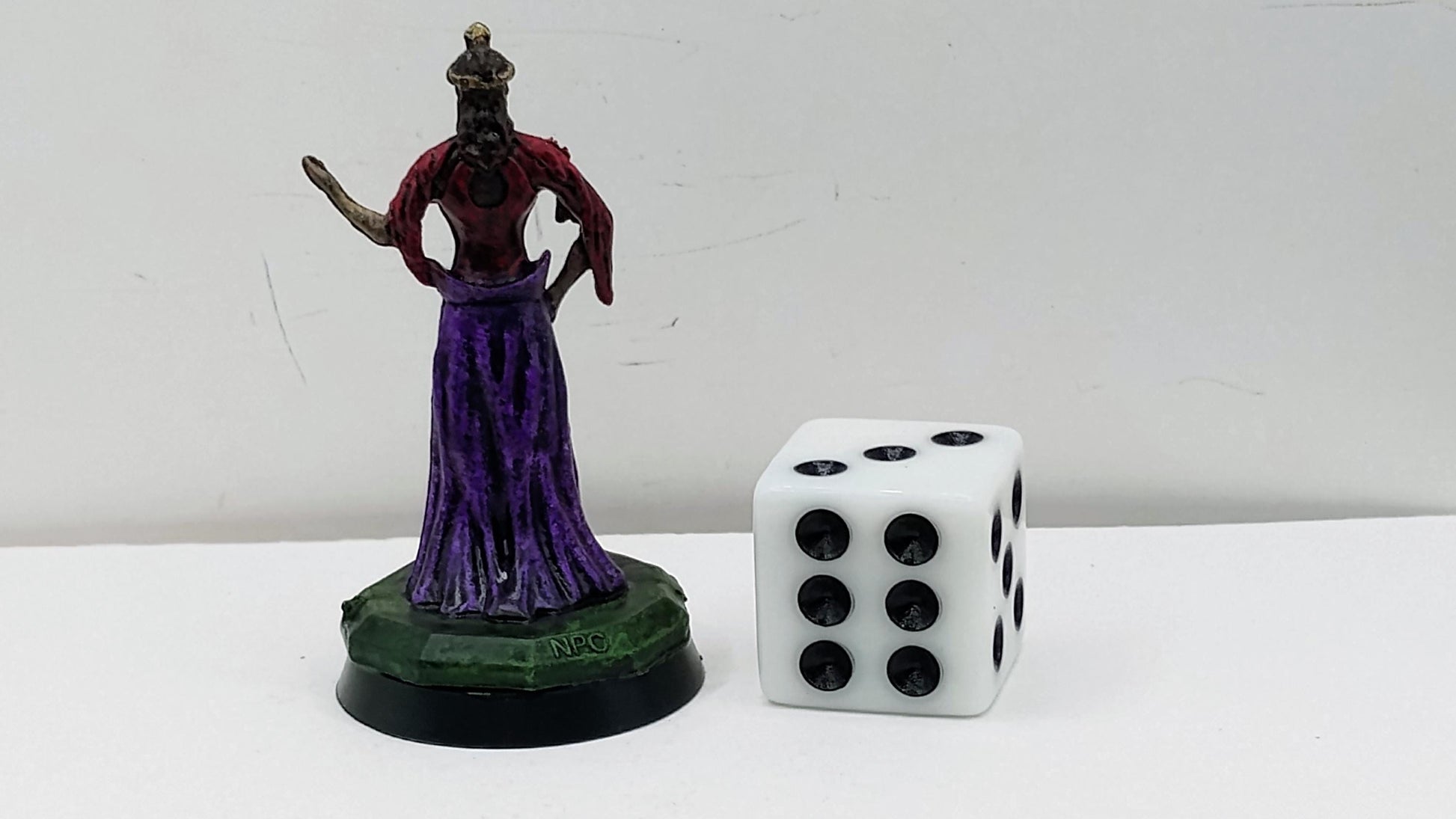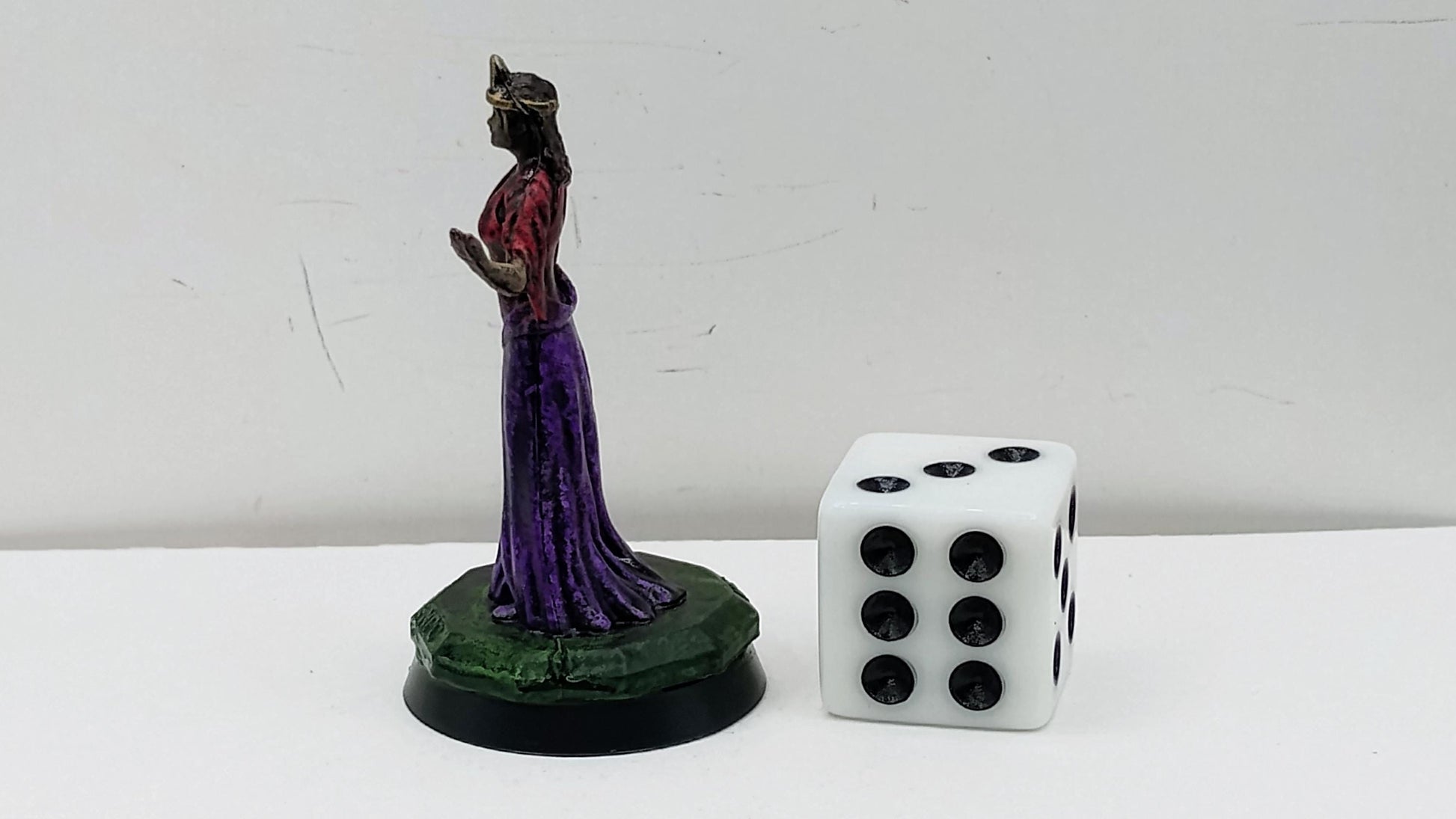 This regal Human Queen stands in quiet authority, adorned in royal red and violet garments and crowned with a golden circlet. Her poised stance and commanding presence mark her as a sovereign both feared and revered