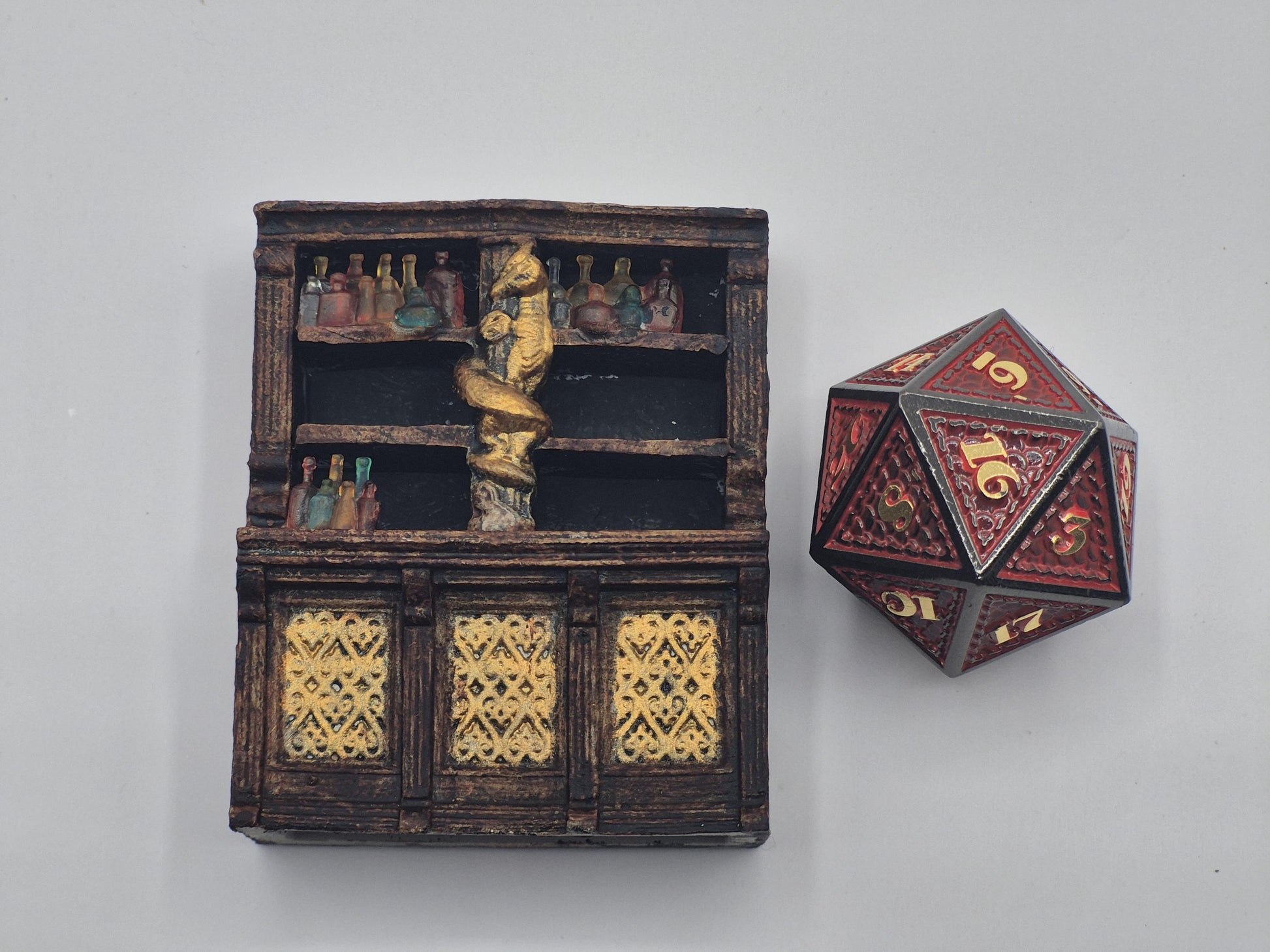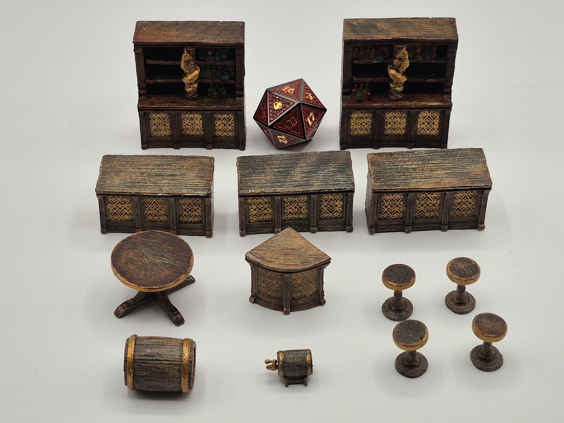 Rusty Dragon Bar 13 pieces. Includes Barrel, Countertop Corner Section, Countertop sections, Shelves with Bottles, Table & Stools.