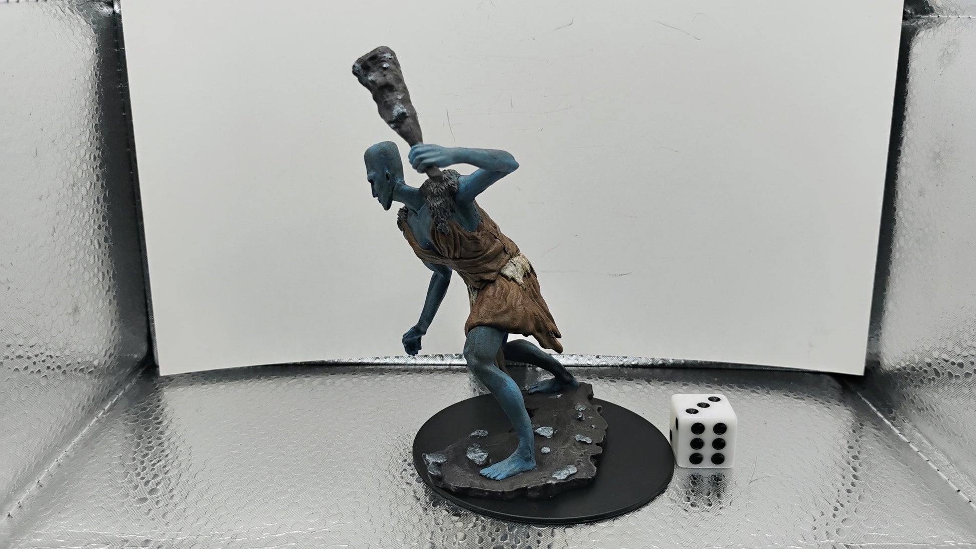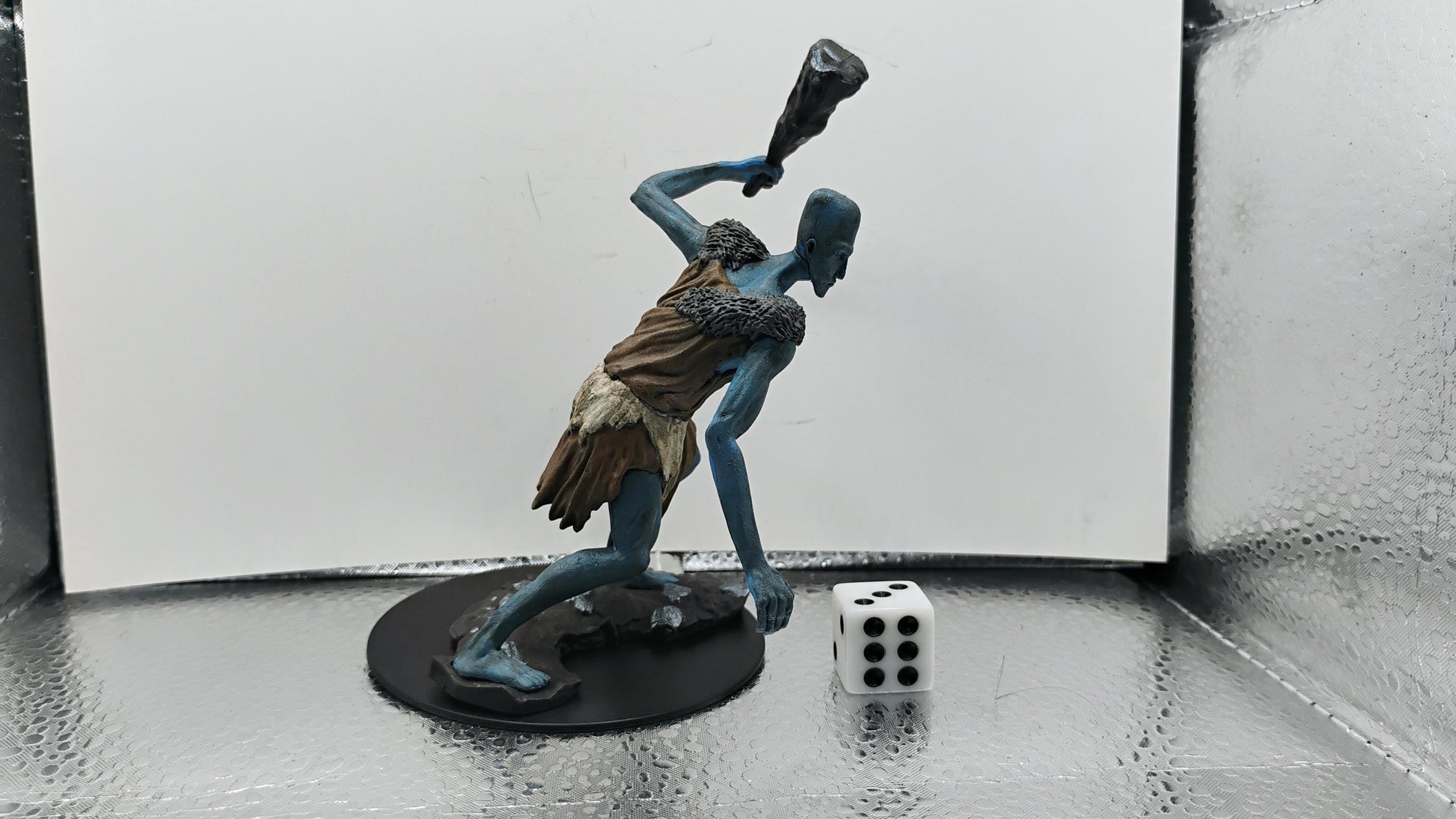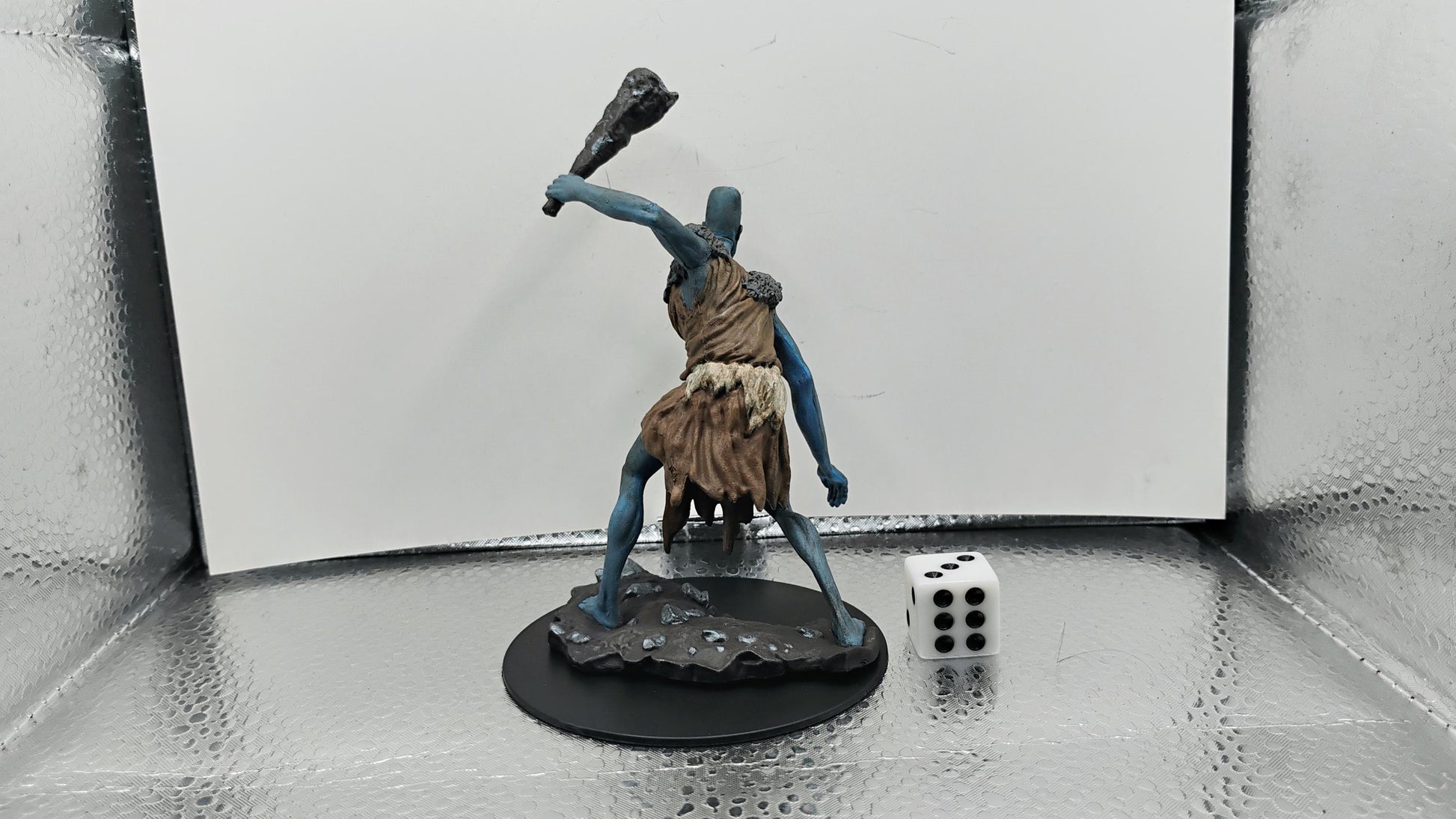This towering Stone Giant hurls forward with a boulder-sized club, his blue-gray skin etched like ancient rock and muscles coiled with primal force. Draped in crude furs and striding across broken earth, he is a relentless juggernaut shaped by the wild peaks he calls home.