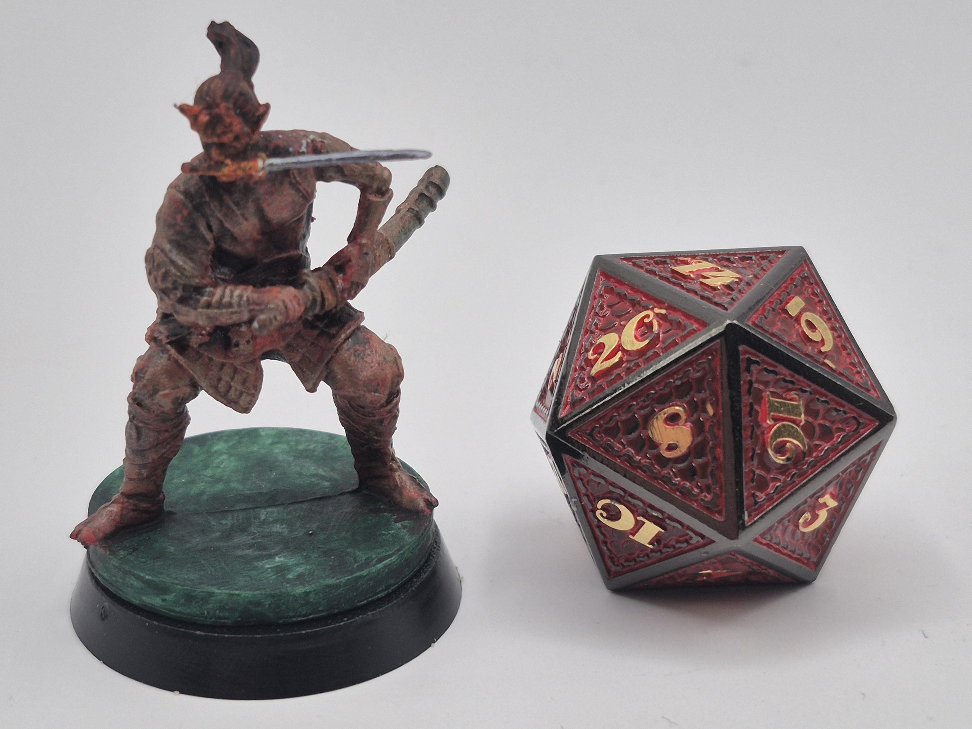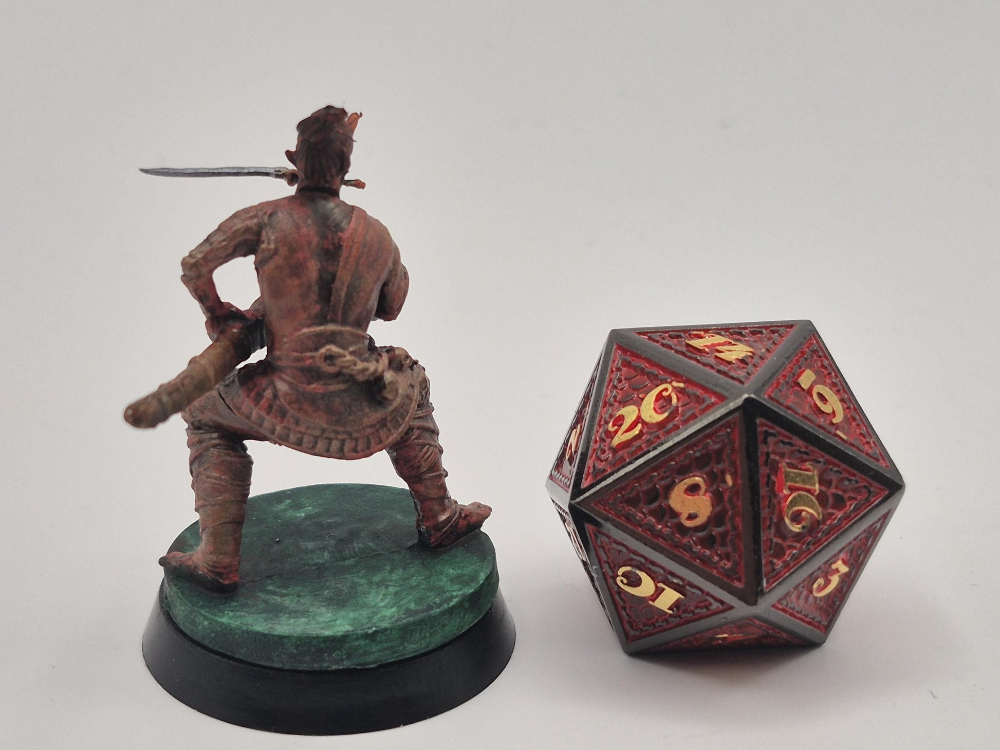 This tiefling samurai stands ready in a low, guarded stance, the edge of his katana gleaming coldly between clenched teeth. Wrapped in crimson armor and unwavering discipline, he is a storm of infernal fury held in perfect stillness-until the moment to strike.