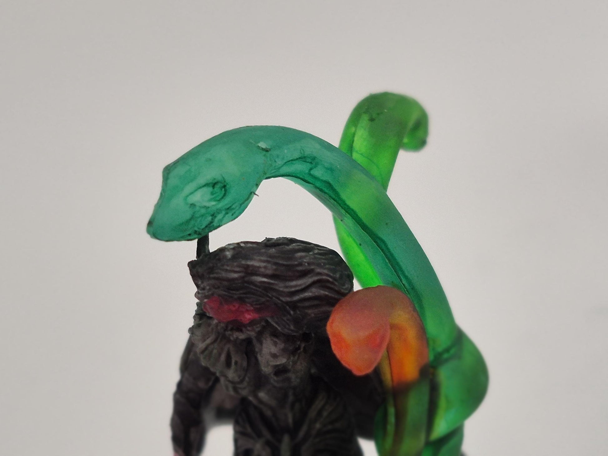 Shrouded in darkness and crowned by spectral serpents, this Tiefling Sorcerer channels chaotic energy with infernal grace. His crimson eyes and cursed bloodline fuel the writhing arcane magic that coils around him like living flame.