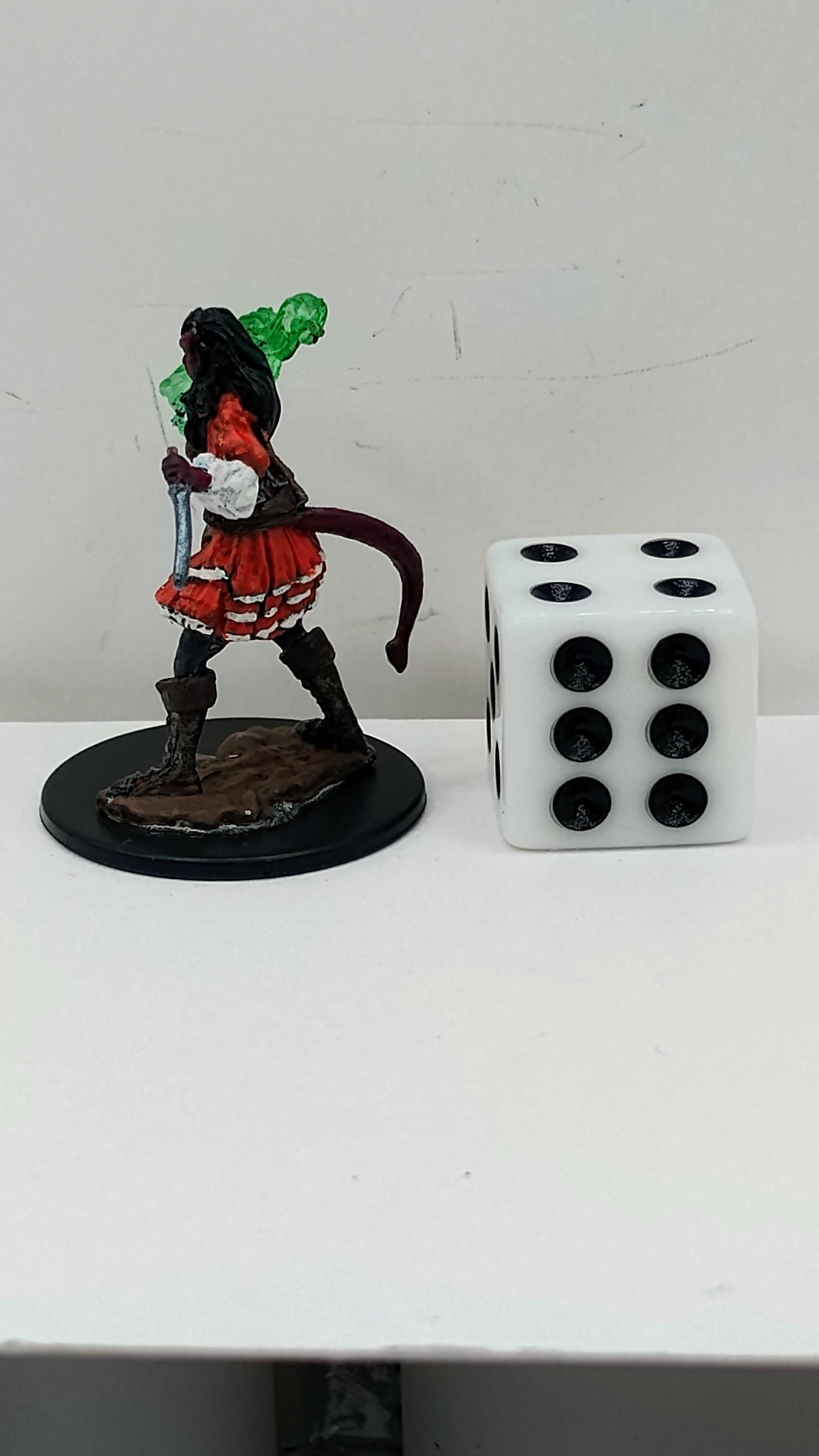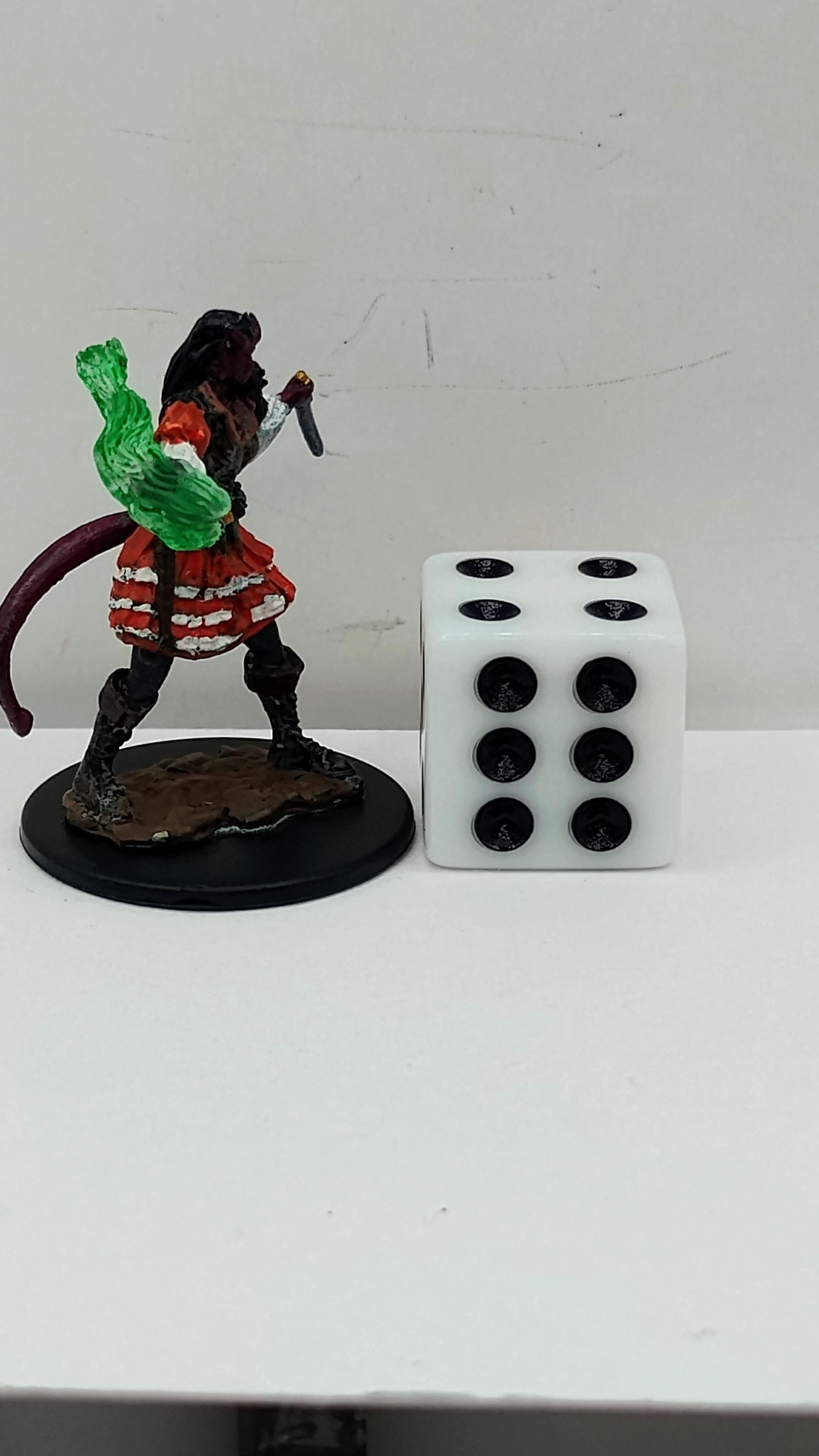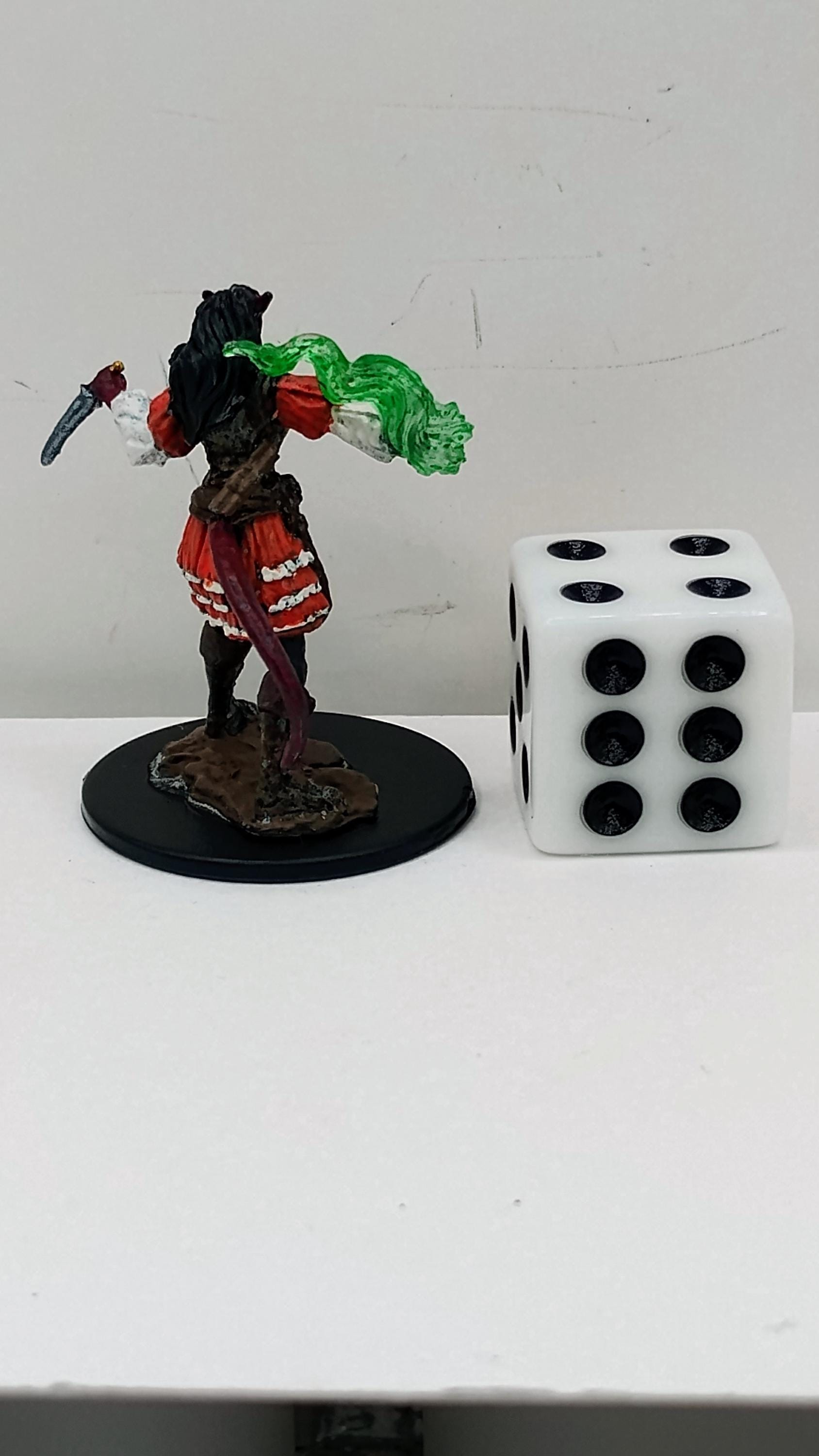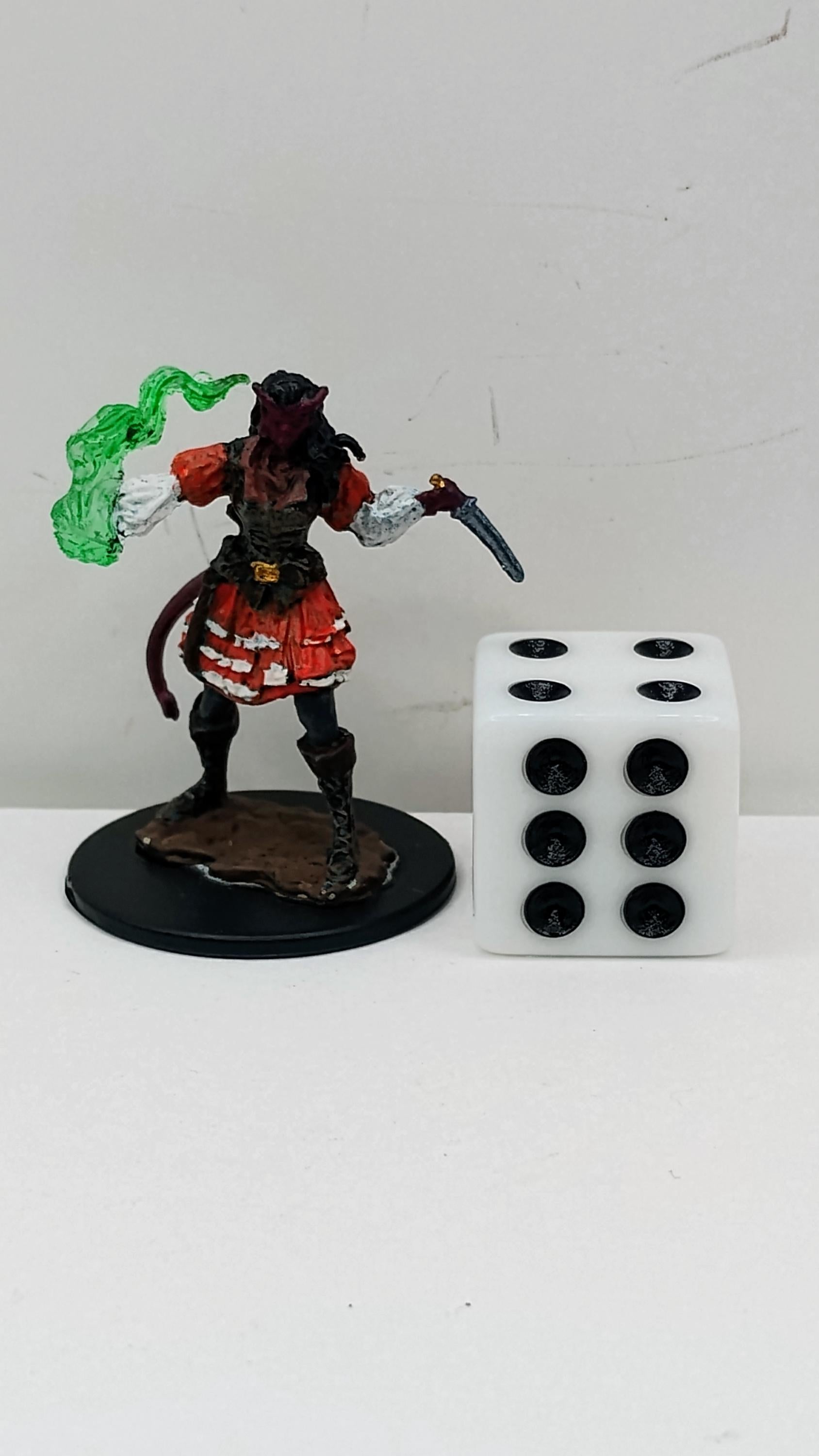 This tiefling sorcerer crackles with wild energy, one hand brandishing a curved blade while the other conjures a swirling green flame. Dressed in a flamboyant red coat with white accents, she strikes a balance between deadly charm and arcane chaos.