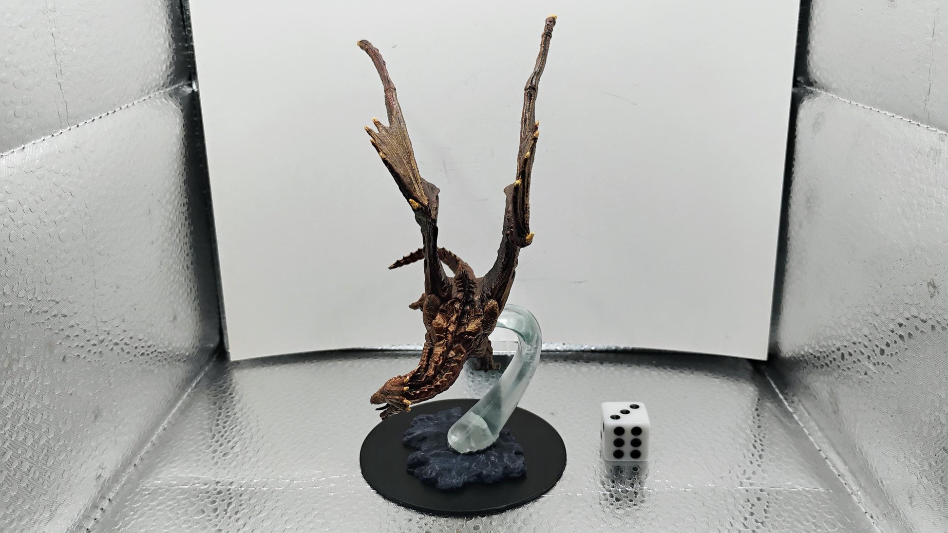 This young bronze dragon dives with electrifying grace, wings flared wide as it arcs toward its target from stormy skies. Its sleek frame and commanding posture hint at a guardian spirit forged by the sea and sharpened by justice.