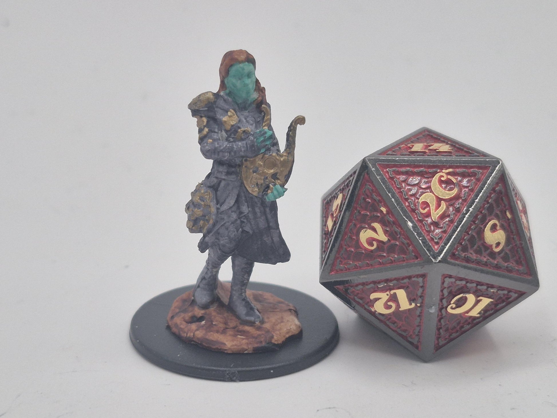 This Yuan-Ti adventurer carries a golden instrument close to their chest, their serpentine green skin and fiery hair creating a striking contrast against their dark armor. With every step upon the worn battlefield, they weave music and magic together, a melody as dangerous as any blade.